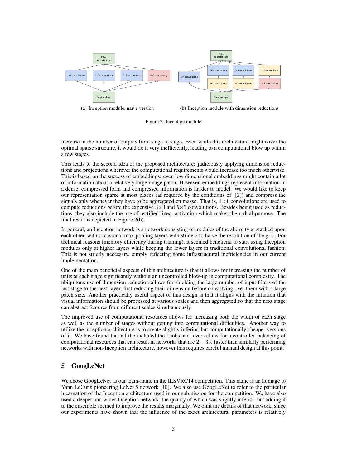 5 . Filter Filter concatenation concatenation 3x3 convolutions 5x5 convolutions 1x1 convolutions 1x1 convolutions 3x3 convolutions 5x5 convolutions 3x3 max pooling 1x1 convolutions 1x1 convolutions 1x1 convolutions 3x3 max pooling Previous layer Previous layer (a) Inception module, na¨ıve version (b) Inception module with dimension reductions Figure 2: Inception module increase in the number of outputs from stage to stage. Even while this architecture might cover the optimal sparse structure, it would do it very inefficiently, leading to a computational blow up within a few stages. This leads to the second idea of the proposed architecture: judiciously applying dimension reduc- tions and projections wherever the computational requirements would increase too much otherwise. This is based on the success of embeddings: even low dimensional embeddings might contain a lot of information about a relatively large image patch. However, embeddings represent information in a dense, compressed form and compressed information is harder to model. We would like to keep our representation sparse at most places (as required by the conditions of [2]) and compress the signals only whenever they have to be aggregated en masse. That is, 1×1 convolutions are used to compute reductions before the expensive 3×3 and 5×5 convolutions. Besides being used as reduc- tions, they also include the use of rectified linear activation which makes them dual-purpose. The final result is depicted in Figure 2(b). In general, an Inception network is a network consisting of modules of the above type stacked upon each other, with occasional max-pooling layers with stride 2 to halve the resolution of the grid. For technical reasons (memory efficiency during training), it seemed beneficial to start using Inception modules only at higher layers while keeping the lower layers in traditional convolutional fashion. This is not strictly necessary, simply reflecting some infrastructural inefficiencies in our current implementation. One of the main beneficial aspects of this architecture is that it allows for increasing the number of units at each stage significantly without an uncontrolled blow-up in computational complexity. The ubiquitous use of dimension reduction allows for shielding the large number of input filters of the last stage to the next layer, first reducing their dimension before convolving over them with a large patch size. Another practically useful aspect of this design is that it aligns with the intuition that visual information should be processed at various scales and then aggregated so that the next stage can abstract features from different scales simultaneously. The improved use of computational resources allows for increasing both the width of each stage as well as the number of stages without getting into computational difficulties. Another way to utilize the inception architecture is to create slightly inferior, but computationally cheaper versions of it. We have found that all the included the knobs and levers allow for a controlled balancing of computational resources that can result in networks that are 2 − 3× faster than similarly performing networks with non-Inception architecture, however this requires careful manual design at this point. 5 GoogLeNet We chose GoogLeNet as our team-name in the ILSVRC14 competition. This name is an homage to Yann LeCuns pioneering LeNet 5 network [10]. We also use GoogLeNet to refer to the particular incarnation of the Inception architecture used in our submission for the competition. We have also used a deeper and wider Inception network, the quality of which was slightly inferior, but adding it to the ensemble seemed to improve the results marginally. We omit the details of that network, since our experiments have shown that the influence of the exact architectural parameters is relatively 5