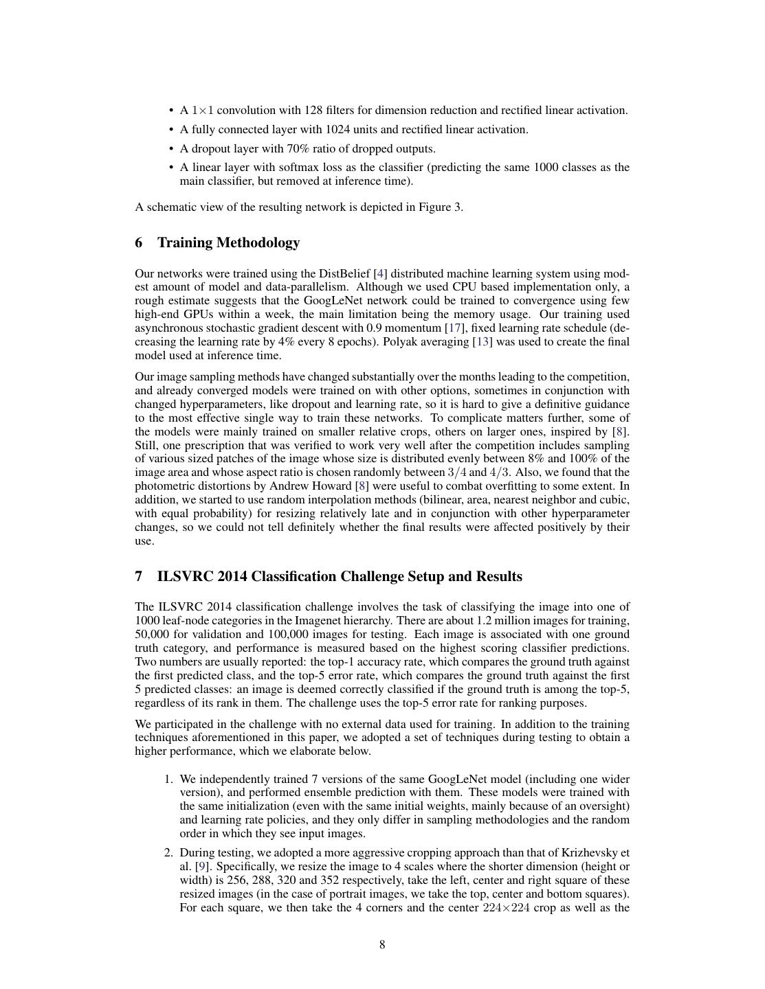 8 . • A 1×1 convolution with 128 filters for dimension reduction and rectified linear activation. • A fully connected layer with 1024 units and rectified linear activation. • A dropout layer with 70% ratio of dropped outputs. • A linear layer with softmax loss as the classifier (predicting the same 1000 classes as the main classifier, but removed at inference time). A schematic view of the resulting network is depicted in Figure 3. 6 Training Methodology Our networks were trained using the DistBelief [4] distributed machine learning system using mod- est amount of model and data-parallelism. Although we used CPU based implementation only, a rough estimate suggests that the GoogLeNet network could be trained to convergence using few high-end GPUs within a week, the main limitation being the memory usage. Our training used asynchronous stochastic gradient descent with 0.9 momentum [17], fixed learning rate schedule (de- creasing the learning rate by 4% every 8 epochs). Polyak averaging [13] was used to create the final model used at inference time. Our image sampling methods have changed substantially over the months leading to the competition, and already converged models were trained on with other options, sometimes in conjunction with changed hyperparameters, like dropout and learning rate, so it is hard to give a definitive guidance to the most effective single way to train these networks. To complicate matters further, some of the models were mainly trained on smaller relative crops, others on larger ones, inspired by [8]. Still, one prescription that was verified to work very well after the competition includes sampling of various sized patches of the image whose size is distributed evenly between 8% and 100% of the image area and whose aspect ratio is chosen randomly between 3/4 and 4/3. Also, we found that the photometric distortions by Andrew Howard [8] were useful to combat overfitting to some extent. In addition, we started to use random interpolation methods (bilinear, area, nearest neighbor and cubic, with equal probability) for resizing relatively late and in conjunction with other hyperparameter changes, so we could not tell definitely whether the final results were affected positively by their use. 7 ILSVRC 2014 Classification Challenge Setup and Results The ILSVRC 2014 classification challenge involves the task of classifying the image into one of 1000 leaf-node categories in the Imagenet hierarchy. There are about 1.2 million images for training, 50,000 for validation and 100,000 images for testing. Each image is associated with one ground truth category, and performance is measured based on the highest scoring classifier predictions. Two numbers are usually reported: the top-1 accuracy rate, which compares the ground truth against the first predicted class, and the top-5 error rate, which compares the ground truth against the first 5 predicted classes: an image is deemed correctly classified if the ground truth is among the top-5, regardless of its rank in them. The challenge uses the top-5 error rate for ranking purposes. We participated in the challenge with no external data used for training. In addition to the training techniques aforementioned in this paper, we adopted a set of techniques during testing to obtain a higher performance, which we elaborate below. 1. We independently trained 7 versions of the same GoogLeNet model (including one wider version), and performed ensemble prediction with them. These models were trained with the same initialization (even with the same initial weights, mainly because of an oversight) and learning rate policies, and they only differ in sampling methodologies and the random order in which they see input images. 2. During testing, we adopted a more aggressive cropping approach than that of Krizhevsky et al. [9]. Specifically, we resize the image to 4 scales where the shorter dimension (height or width) is 256, 288, 320 and 352 respectively, take the left, center and right square of these resized images (in the case of portrait images, we take the top, center and bottom squares). For each square, we then take the 4 corners and the center 224×224 crop as well as the 8