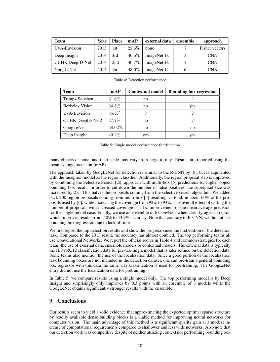 10 . Team Year Place mAP external data ensemble approach UvA-Euvision 2013 1st 22.6% none ? Fisher vectors Deep Insight 2014 3rd 40.5% ImageNet 1k 3 CNN CUHK DeepID-Net 2014 2nd 40.7% ImageNet 1k ? CNN GoogLeNet 2014 1st 43.9% ImageNet 1k 6 CNN Table 4: Detection performance Team mAP Contextual model Bounding box regression Trimps-Soushen 31.6% no ? Berkeley Vision 34.5% no yes UvA-Euvision 35.4% ? ? CUHK DeepID-Net2 37.7% no ? GoogLeNet 38.02% no no Deep Insight 40.2% yes yes Table 5: Single model performance for detection many objects or none, and their scale may vary from large to tiny. Results are reported using the mean average precision (mAP). The approach taken by GoogLeNet for detection is similar to the R-CNN by [6], but is augmented with the Inception model as the region classifier. Additionally, the region proposal step is improved by combining the Selective Search [20] approach with multi-box [5] predictions for higher object bounding box recall. In order to cut down the number of false positives, the superpixel size was increased by 2×. This halves the proposals coming from the selective search algorithm. We added back 200 region proposals coming from multi-box [5] resulting, in total, in about 60% of the pro- posals used by [6], while increasing the coverage from 92% to 93%. The overall effect of cutting the number of proposals with increased coverage is a 1% improvement of the mean average precision for the single model case. Finally, we use an ensemble of 6 ConvNets when classifying each region which improves results from 40% to 43.9% accuracy. Note that contrary to R-CNN, we did not use bounding box regression due to lack of time. We first report the top detection results and show the progress since the first edition of the detection task. Compared to the 2013 result, the accuracy has almost doubled. The top performing teams all use Convolutional Networks. We report the official scores in Table 4 and common strategies for each team: the use of external data, ensemble models or contextual models. The external data is typically the ILSVRC12 classification data for pre-training a model that is later refined on the detection data. Some teams also mention the use of the localization data. Since a good portion of the localization task bounding boxes are not included in the detection dataset, one can pre-train a general bounding box regressor with this data the same way classification is used for pre-training. The GoogLeNet entry did not use the localization data for pretraining. In Table 5, we compare results using a single model only. The top performing model is by Deep Insight and surprisingly only improves by 0.3 points with an ensemble of 3 models while the GoogLeNet obtains significantly stronger results with the ensemble. 9 Conclusions Our results seem to yield a solid evidence that approximating the expected optimal sparse structure by readily available dense building blocks is a viable method for improving neural networks for computer vision. The main advantage of this method is a significant quality gain at a modest in- crease of computational requirements compared to shallower and less wide networks. Also note that our detection work was competitive despite of neither utilizing context nor performing bounding box 10