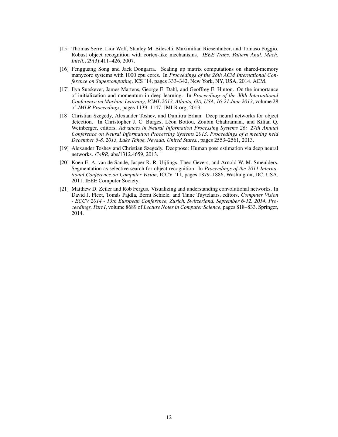 12 .[15] Thomas Serre, Lior Wolf, Stanley M. Bileschi, Maximilian Riesenhuber, and Tomaso Poggio. Robust object recognition with cortex-like mechanisms. IEEE Trans. Pattern Anal. Mach. Intell., 29(3):411–426, 2007. [16] Fengguang Song and Jack Dongarra. Scaling up matrix computations on shared-memory manycore systems with 1000 cpu cores. In Proceedings of the 28th ACM International Con- ference on Supercomputing, ICS ’14, pages 333–342, New York, NY, USA, 2014. ACM. [17] Ilya Sutskever, James Martens, George E. Dahl, and Geoffrey E. Hinton. On the importance of initialization and momentum in deep learning. In Proceedings of the 30th International Conference on Machine Learning, ICML 2013, Atlanta, GA, USA, 16-21 June 2013, volume 28 of JMLR Proceedings, pages 1139–1147. JMLR.org, 2013. [18] Christian Szegedy, Alexander Toshev, and Dumitru Erhan. Deep neural networks for object detection. In Christopher J. C. Burges, L´eon Bottou, Zoubin Ghahramani, and Kilian Q. Weinberger, editors, Advances in Neural Information Processing Systems 26: 27th Annual Conference on Neural Information Processing Systems 2013. Proceedings of a meeting held December 5-8, 2013, Lake Tahoe, Nevada, United States., pages 2553–2561, 2013. [19] Alexander Toshev and Christian Szegedy. Deeppose: Human pose estimation via deep neural networks. CoRR, abs/1312.4659, 2013. [20] Koen E. A. van de Sande, Jasper R. R. Uijlings, Theo Gevers, and Arnold W. M. Smeulders. Segmentation as selective search for object recognition. In Proceedings of the 2011 Interna- tional Conference on Computer Vision, ICCV ’11, pages 1879–1886, Washington, DC, USA, 2011. IEEE Computer Society. [21] Matthew D. Zeiler and Rob Fergus. Visualizing and understanding convolutional networks. In David J. Fleet, Tom´as Pajdla, Bernt Schiele, and Tinne Tuytelaars, editors, Computer Vision - ECCV 2014 - 13th European Conference, Zurich, Switzerland, September 6-12, 2014, Pro- ceedings, Part I, volume 8689 of Lecture Notes in Computer Science, pages 818–833. Springer, 2014. 12