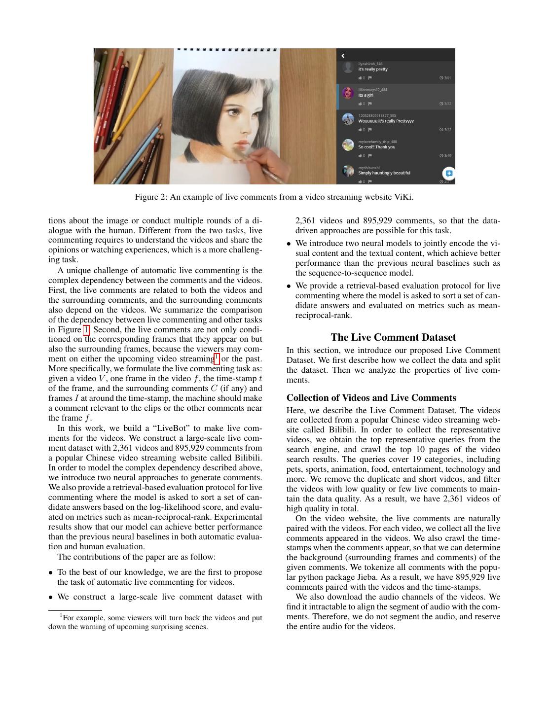 2 . Figure 2: An example of live comments from a video streaming website ViKi. tions about the image or conduct multiple rounds of a di- 2,361 videos and 895,929 comments, so that the data- alogue with the human. Different from the two tasks, live driven approaches are possible for this task. commenting requires to understand the videos and share the • We introduce two neural models to jointly encode the vi- opinions or watching experiences, which is a more challeng- sual content and the textual content, which achieve better ing task. performance than the previous neural baselines such as A unique challenge of automatic live commenting is the the sequence-to-sequence model. complex dependency between the comments and the videos. First, the live comments are related to both the videos and • We provide a retrieval-based evaluation protocol for live the surrounding comments, and the surrounding comments commenting where the model is asked to sort a set of can- also depend on the videos. We summarize the comparison didate answers and evaluated on metrics such as mean- of the dependency between live commenting and other tasks reciprocal-rank. in Figure 1. Second, the live comments are not only condi- tioned on the corresponding frames that they appear on but The Live Comment Dataset also the surrounding frames, because the viewers may com- In this section, we introduce our proposed Live Comment ment on either the upcoming video streaming1 or the past. Dataset. We first describe how we collect the data and split More specifically, we formulate the live commenting task as: the dataset. Then we analyze the properties of live com- given a video V , one frame in the video f , the time-stamp t ments. of the frame, and the surrounding comments C (if any) and frames I at around the time-stamp, the machine should make Collection of Videos and Live Comments a comment relevant to the clips or the other comments near Here, we describe the Live Comment Dataset. The videos the frame f . are collected from a popular Chinese video streaming web- In this work, we build a “LiveBot” to make live com- site called Bilibili. In order to collect the representative ments for the videos. We construct a large-scale live com- videos, we obtain the top representative queries from the ment dataset with 2,361 videos and 895,929 comments from search engine, and crawl the top 10 pages of the video a popular Chinese video streaming website called Bilibili. search results. The queries cover 19 categories, including In order to model the complex dependency described above, pets, sports, animation, food, entertainment, technology and we introduce two neural approaches to generate comments. more. We remove the duplicate and short videos, and filter We also provide a retrieval-based evaluation protocol for live the videos with low quality or few live comments to main- commenting where the model is asked to sort a set of can- tain the data quality. As a result, we have 2,361 videos of didate answers based on the log-likelihood score, and evalu- high quality in total. ated on metrics such as mean-reciprocal-rank. Experimental On the video website, the live comments are naturally results show that our model can achieve better performance paired with the videos. For each video, we collect all the live than the previous neural baselines in both automatic evalua- comments appeared in the videos. We also crawl the time- tion and human evaluation. stamps when the comments appear, so that we can determine The contributions of the paper are as follow: the background (surrounding frames and comments) of the given comments. We tokenize all comments with the popu- • To the best of our knowledge, we are the first to propose lar python package Jieba. As a result, we have 895,929 live the task of automatic live commenting for videos. comments paired with the videos and the time-stamps. • We construct a large-scale live comment dataset with We also download the audio channels of the videos. We find it intractable to align the segment of audio with the com- 1 ments. Therefore, we do not segment the audio, and reserve For example, some viewers will turn back the videos and put down the warning of upcoming surprising scenes. the entire audio for the videos.