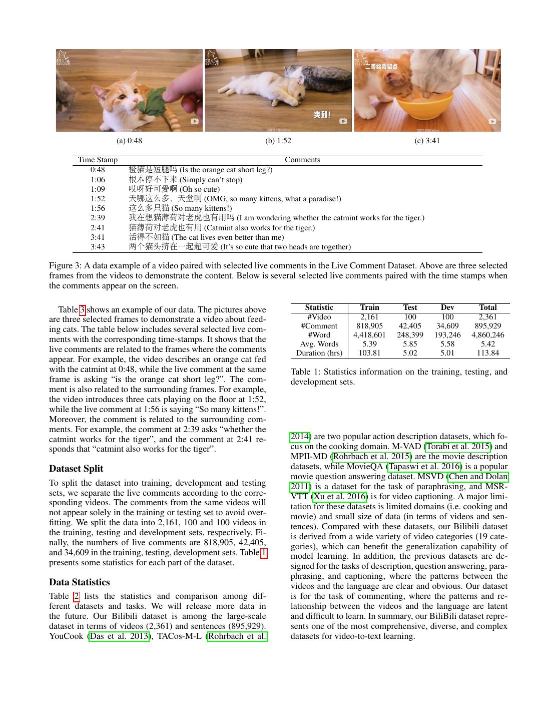 3 . (a) 0:48 (b) 1:52 (c) 3:41 Time Stamp Comments 0:48 橙猫是短腿吗 (Is the orange cat short leg?) 1:06 根本停不下来 (Simply can’t stop) 1:09 哎呀好可爱啊 (Oh so cute) 1:52 天哪这么多,天堂啊 (OMG, so many kittens, what a paradise!) 1:56 这么多只猫 (So many kittens!) 2:39 我在想猫薄荷对老虎也有用吗 (I am wondering whether the catmint works for the tiger.) 2:41 猫薄荷对老虎也有用 (Catmint also works for the tiger.) 3:41 活得不如猫 (The cat lives even better than me) 3:43 两个猫头挤在一起超可爱 (It’s so cute that two heads are together) Figure 3: A data example of a video paired with selected live comments in the Live Comment Dataset. Above are three selected frames from the videos to demonstrate the content. Below is several selected live comments paired with the time stamps when the comments appear on the screen. Table 3 shows an example of our data. The pictures above Statistic Train Test Dev Total are three selected frames to demonstrate a video about feed- #Video 2,161 100 100 2,361 ing cats. The table below includes several selected live com- #Comment 818,905 42,405 34,609 895,929 #Word 4,418,601 248,399 193,246 4,860,246 ments with the corresponding time-stamps. It shows that the Avg. Words 5.39 5.85 5.58 5.42 live comments are related to the frames where the comments Duration (hrs) 103.81 5.02 5.01 113.84 appear. For example, the video describes an orange cat fed with the catmint at 0:48, while the live comment at the same Table 1: Statistics information on the training, testing, and frame is asking “is the orange cat short leg?”. The com- development sets. ment is also related to the surrounding frames. For example, the video introduces three cats playing on the floor at 1:52, while the live comment at 1:56 is saying “So many kittens!”. Moreover, the comment is related to the surrounding com- ments. For example, the comment at 2:39 asks “whether the catmint works for the tiger”, and the comment at 2:41 re- 2014) are two popular action description datasets, which fo- sponds that “catmint also works for the tiger”. cus on the cooking domain. M-VAD (Torabi et al. 2015) and MPII-MD (Rohrbach et al. 2015) are the movie description Dataset Split datasets, while MovieQA (Tapaswi et al. 2016) is a popular movie question answering dataset. MSVD (Chen and Dolan To split the dataset into training, development and testing 2011) is a dataset for the task of paraphrasing, and MSR- sets, we separate the live comments according to the corre- VTT (Xu et al. 2016) is for video captioning. A major limi- sponding videos. The comments from the same videos will tation for these datasets is limited domains (i.e. cooking and not appear solely in the training or testing set to avoid over- movie) and small size of data (in terms of videos and sen- fitting. We split the data into 2,161, 100 and 100 videos in tences). Compared with these datasets, our Bilibili dataset the training, testing and development sets, respectively. Fi- is derived from a wide variety of video categories (19 cate- nally, the numbers of live comments are 818,905, 42,405, gories), which can benefit the generalization capability of and 34,609 in the training, testing, development sets. Table 1 model learning. In addition, the previous datasets are de- presents some statistics for each part of the dataset. signed for the tasks of description, question answering, para- phrasing, and captioning, where the patterns between the Data Statistics videos and the language are clear and obvious. Our dataset Table 2 lists the statistics and comparison among dif- is for the task of commenting, where the patterns and re- ferent datasets and tasks. We will release more data in lationship between the videos and the language are latent the future. Our Bilibili dataset is among the large-scale and difficult to learn. In summary, our BiliBili dataset repre- dataset in terms of videos (2,361) and sentences (895,929). sents one of the most comprehensive, diverse, and complex YouCook (Das et al. 2013), TACos-M-L (Rohrbach et al. datasets for video-to-text learning.