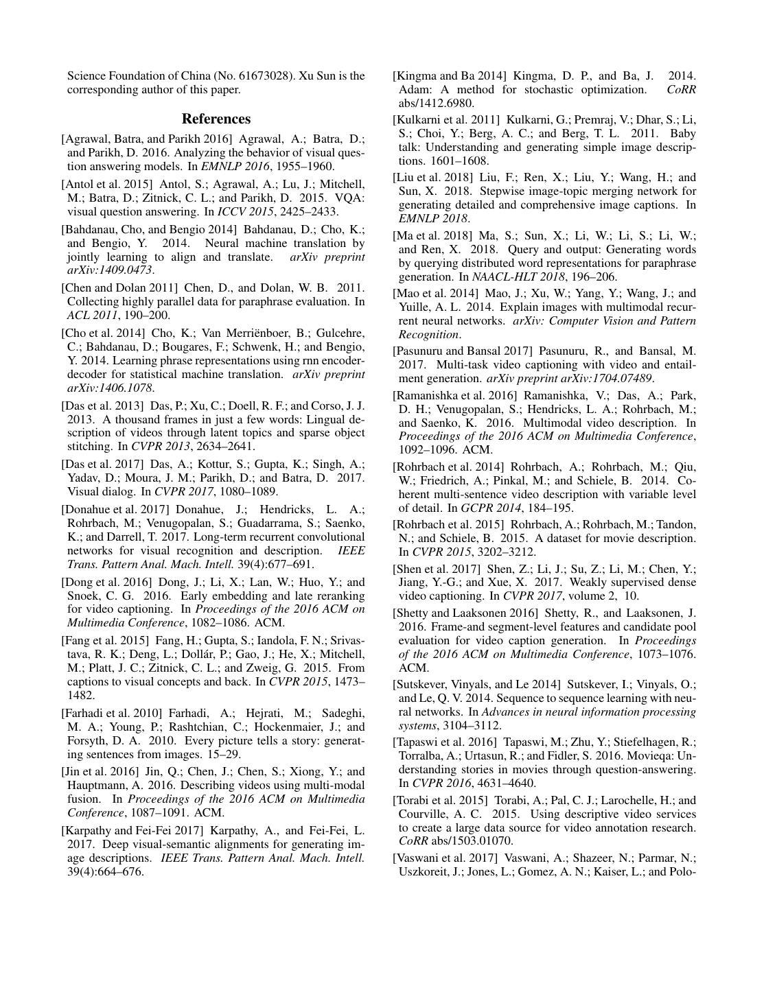 8 . Science Foundation of China (No. 61673028). Xu Sun is the [Kingma and Ba 2014] Kingma, D. P., and Ba, J. 2014. corresponding author of this paper. Adam: A method for stochastic optimization. CoRR abs/1412.6980. References [Kulkarni et al. 2011] Kulkarni, G.; Premraj, V.; Dhar, S.; Li, [Agrawal, Batra, and Parikh 2016] Agrawal, A.; Batra, D.; S.; Choi, Y.; Berg, A. C.; and Berg, T. L. 2011. Baby and Parikh, D. 2016. Analyzing the behavior of visual ques- talk: Understanding and generating simple image descrip- tion answering models. In EMNLP 2016, 1955–1960. tions. 1601–1608. [Liu et al. 2018] Liu, F.; Ren, X.; Liu, Y.; Wang, H.; and [Antol et al. 2015] Antol, S.; Agrawal, A.; Lu, J.; Mitchell, Sun, X. 2018. Stepwise image-topic merging network for M.; Batra, D.; Zitnick, C. L.; and Parikh, D. 2015. VQA: generating detailed and comprehensive image captions. In visual question answering. In ICCV 2015, 2425–2433. EMNLP 2018. [Bahdanau, Cho, and Bengio 2014] Bahdanau, D.; Cho, K.; [Ma et al. 2018] Ma, S.; Sun, X.; Li, W.; Li, S.; Li, W.; and Bengio, Y. 2014. Neural machine translation by and Ren, X. 2018. Query and output: Generating words jointly learning to align and translate. arXiv preprint by querying distributed word representations for paraphrase arXiv:1409.0473. generation. In NAACL-HLT 2018, 196–206. [Chen and Dolan 2011] Chen, D., and Dolan, W. B. 2011. [Mao et al. 2014] Mao, J.; Xu, W.; Yang, Y.; Wang, J.; and Collecting highly parallel data for paraphrase evaluation. In Yuille, A. L. 2014. Explain images with multimodal recur- ACL 2011, 190–200. rent neural networks. arXiv: Computer Vision and Pattern [Cho et al. 2014] Cho, K.; Van Merri¨enboer, B.; Gulcehre, Recognition. C.; Bahdanau, D.; Bougares, F.; Schwenk, H.; and Bengio, [Pasunuru and Bansal 2017] Pasunuru, R., and Bansal, M. Y. 2014. Learning phrase representations using rnn encoder- 2017. Multi-task video captioning with video and entail- decoder for statistical machine translation. arXiv preprint ment generation. arXiv preprint arXiv:1704.07489. arXiv:1406.1078. [Ramanishka et al. 2016] Ramanishka, V.; Das, A.; Park, [Das et al. 2013] Das, P.; Xu, C.; Doell, R. F.; and Corso, J. J. D. H.; Venugopalan, S.; Hendricks, L. A.; Rohrbach, M.; 2013. A thousand frames in just a few words: Lingual de- and Saenko, K. 2016. Multimodal video description. In scription of videos through latent topics and sparse object Proceedings of the 2016 ACM on Multimedia Conference, stitching. In CVPR 2013, 2634–2641. 1092–1096. ACM. [Das et al. 2017] Das, A.; Kottur, S.; Gupta, K.; Singh, A.; [Rohrbach et al. 2014] Rohrbach, A.; Rohrbach, M.; Qiu, Yadav, D.; Moura, J. M.; Parikh, D.; and Batra, D. 2017. W.; Friedrich, A.; Pinkal, M.; and Schiele, B. 2014. Co- Visual dialog. In CVPR 2017, 1080–1089. herent multi-sentence video description with variable level [Donahue et al. 2017] Donahue, J.; Hendricks, L. A.; of detail. In GCPR 2014, 184–195. Rohrbach, M.; Venugopalan, S.; Guadarrama, S.; Saenko, [Rohrbach et al. 2015] Rohrbach, A.; Rohrbach, M.; Tandon, K.; and Darrell, T. 2017. Long-term recurrent convolutional N.; and Schiele, B. 2015. A dataset for movie description. networks for visual recognition and description. IEEE In CVPR 2015, 3202–3212. Trans. Pattern Anal. Mach. Intell. 39(4):677–691. [Shen et al. 2017] Shen, Z.; Li, J.; Su, Z.; Li, M.; Chen, Y.; [Dong et al. 2016] Dong, J.; Li, X.; Lan, W.; Huo, Y.; and Jiang, Y.-G.; and Xue, X. 2017. Weakly supervised dense Snoek, C. G. 2016. Early embedding and late reranking video captioning. In CVPR 2017, volume 2, 10. for video captioning. In Proceedings of the 2016 ACM on [Shetty and Laaksonen 2016] Shetty, R., and Laaksonen, J. Multimedia Conference, 1082–1086. ACM. 2016. Frame-and segment-level features and candidate pool [Fang et al. 2015] Fang, H.; Gupta, S.; Iandola, F. N.; Srivas- evaluation for video caption generation. In Proceedings tava, R. K.; Deng, L.; Doll´ar, P.; Gao, J.; He, X.; Mitchell, of the 2016 ACM on Multimedia Conference, 1073–1076. M.; Platt, J. C.; Zitnick, C. L.; and Zweig, G. 2015. From ACM. captions to visual concepts and back. In CVPR 2015, 1473– [Sutskever, Vinyals, and Le 2014] Sutskever, I.; Vinyals, O.; 1482. and Le, Q. V. 2014. Sequence to sequence learning with neu- [Farhadi et al. 2010] Farhadi, A.; Hejrati, M.; Sadeghi, ral networks. In Advances in neural information processing M. A.; Young, P.; Rashtchian, C.; Hockenmaier, J.; and systems, 3104–3112. Forsyth, D. A. 2010. Every picture tells a story: generat- [Tapaswi et al. 2016] Tapaswi, M.; Zhu, Y.; Stiefelhagen, R.; ing sentences from images. 15–29. Torralba, A.; Urtasun, R.; and Fidler, S. 2016. Movieqa: Un- [Jin et al. 2016] Jin, Q.; Chen, J.; Chen, S.; Xiong, Y.; and derstanding stories in movies through question-answering. Hauptmann, A. 2016. Describing videos using multi-modal In CVPR 2016, 4631–4640. fusion. In Proceedings of the 2016 ACM on Multimedia [Torabi et al. 2015] Torabi, A.; Pal, C. J.; Larochelle, H.; and Conference, 1087–1091. ACM. Courville, A. C. 2015. Using descriptive video services [Karpathy and Fei-Fei 2017] Karpathy, A., and Fei-Fei, L. to create a large data source for video annotation research. 2017. Deep visual-semantic alignments for generating im- CoRR abs/1503.01070. age descriptions. IEEE Trans. Pattern Anal. Mach. Intell. [Vaswani et al. 2017] Vaswani, A.; Shazeer, N.; Parmar, N.; 39(4):664–676. Uszkoreit, J.; Jones, L.; Gomez, A. N.; Kaiser, L.; and Polo-