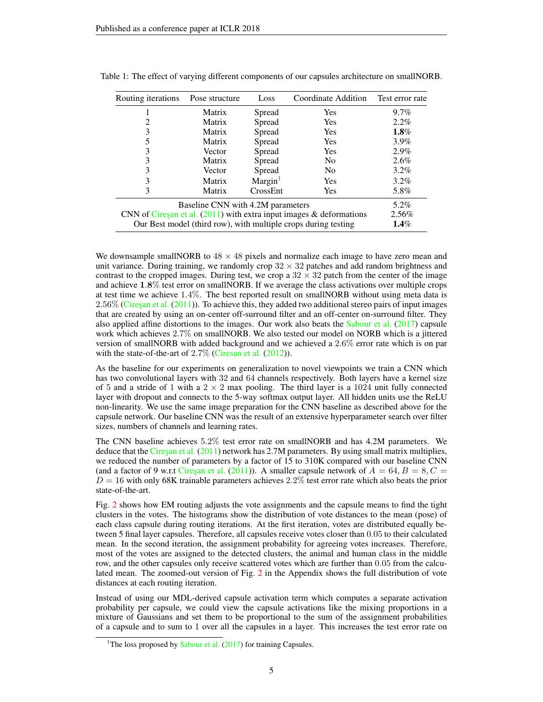 5 .Published as a conference paper at ICLR 2018 Table 1: The effect of varying different components of our capsules architecture on smallNORB. Routing iterations Pose structure Loss Coordinate Addition Test error rate 1 Matrix Spread Yes 9.7% 2 Matrix Spread Yes 2.2% 3 Matrix Spread Yes 1.8% 5 Matrix Spread Yes 3.9% 3 Vector Spread Yes 2.9% 3 Matrix Spread No 2.6% 3 Vector Spread No 3.2% 3 Matrix Margin1 Yes 3.2% 3 Matrix CrossEnt Yes 5.8% Baseline CNN with 4.2M parameters 5.2% CNN of Cires¸an et al. (2011) with extra input images & deformations 2.56% Our Best model (third row), with multiple crops during testing 1.4% We downsample smallNORB to 48 × 48 pixels and normalize each image to have zero mean and unit variance. During training, we randomly crop 32 × 32 patches and add random brightness and contrast to the cropped images. During test, we crop a 32 × 32 patch from the center of the image and achieve 1.8% test error on smallNORB. If we average the class activations over multiple crops at test time we achieve 1.4%. The best reported result on smallNORB without using meta data is 2.56% (Cires¸an et al. (2011)). To achieve this, they added two additional stereo pairs of input images that are created by using an on-center off-surround filter and an off-center on-surround filter. They also applied affine distortions to the images. Our work also beats the Sabour et al. (2017) capsule work which achieves 2.7% on smallNORB. We also tested our model on NORB which is a jittered version of smallNORB with added background and we achieved a 2.6% error rate which is on par with the state-of-the-art of 2.7% (Ciresan et al. (2012)). As the baseline for our experiments on generalization to novel viewpoints we train a CNN which has two convolutional layers with 32 and 64 channels respectively. Both layers have a kernel size of 5 and a stride of 1 with a 2 × 2 max pooling. The third layer is a 1024 unit fully connected layer with dropout and connects to the 5-way softmax output layer. All hidden units use the ReLU non-linearity. We use the same image preparation for the CNN baseline as described above for the capsule network. Our baseline CNN was the result of an extensive hyperparameter search over filter sizes, numbers of channels and learning rates. The CNN baseline achieves 5.2% test error rate on smallNORB and has 4.2M parameters. We deduce that the Cires¸an et al. (2011) network has 2.7M parameters. By using small matrix multiplies, we reduced the number of parameters by a factor of 15 to 310K compared with our baseline CNN (and a factor of 9 w.r.t Cires¸an et al. (2011)). A smaller capsule network of A = 64, B = 8, C = D = 16 with only 68K trainable parameters achieves 2.2% test error rate which also beats the prior state-of-the-art. Fig. 2 shows how EM routing adjusts the vote assignments and the capsule means to find the tight clusters in the votes. The histograms show the distribution of vote distances to the mean (pose) of each class capsule during routing iterations. At the first iteration, votes are distributed equally be- tween 5 final layer capsules. Therefore, all capsules receive votes closer than 0.05 to their calculated mean. In the second iteration, the assignment probability for agreeing votes increases. Therefore, most of the votes are assigned to the detected clusters, the animal and human class in the middle row, and the other capsules only receive scattered votes which are further than 0.05 from the calcu- lated mean. The zoomed-out version of Fig. 2 in the Appendix shows the full distribution of vote distances at each routing iteration. Instead of using our MDL-derived capsule activation term which computes a separate activation probability per capsule, we could view the capsule activations like the mixing proportions in a mixture of Gaussians and set them to be proportional to the sum of the assignment probabilities of a capsule and to sum to 1 over all the capsules in a layer. This increases the test error rate on 1 The loss proposed by Sabour et al. (2017) for training Capsules. 5