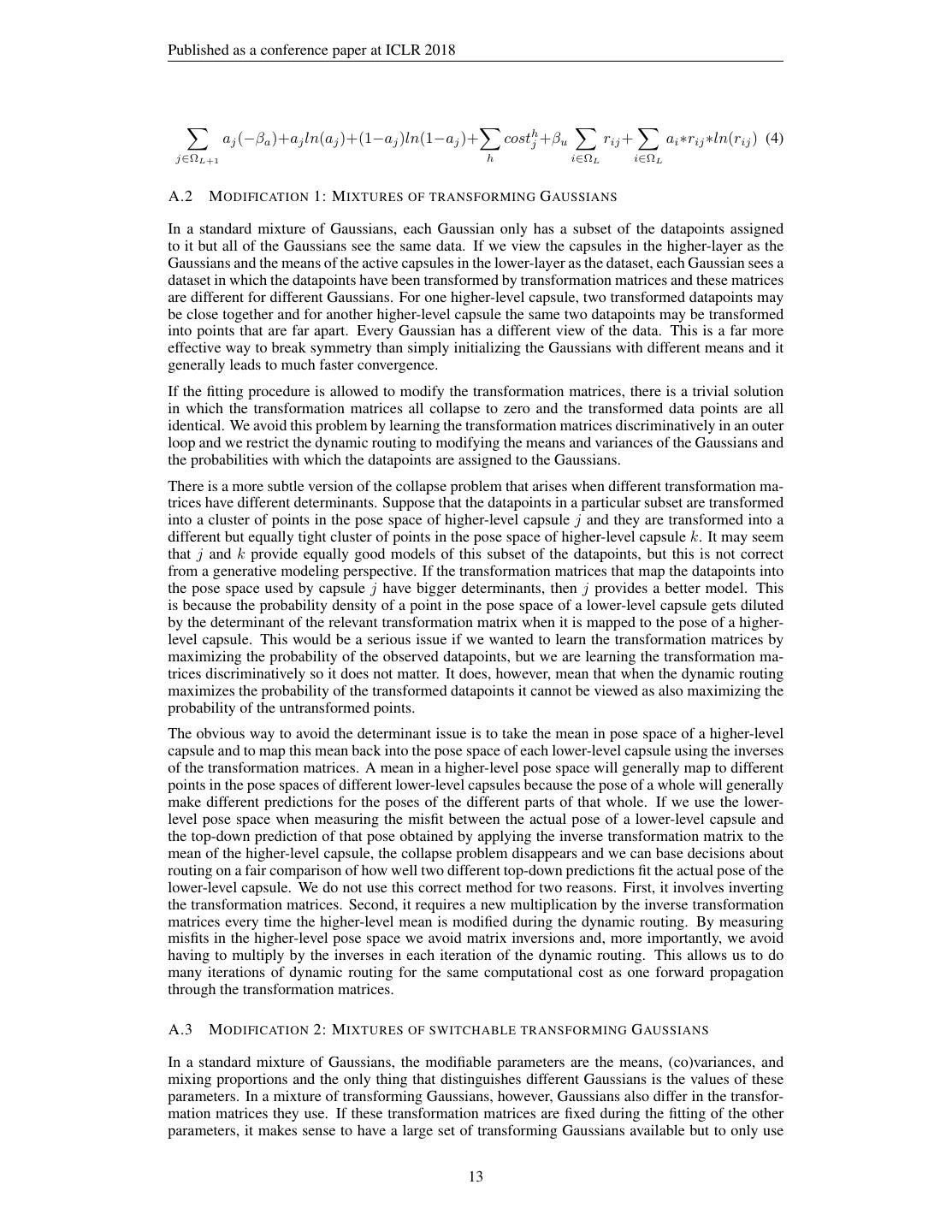 13 .Published as a conference paper at ICLR 2018 aj (−βa )+aj ln(aj )+(1−aj )ln(1−aj )+ costhj +βu rij + ai ∗rij ∗ln(rij ) (4) j∈ΩL+1 h i∈ΩL i∈ΩL A.2 M ODIFICATION 1: M IXTURES OF TRANSFORMING G AUSSIANS In a standard mixture of Gaussians, each Gaussian only has a subset of the datapoints assigned to it but all of the Gaussians see the same data. If we view the capsules in the higher-layer as the Gaussians and the means of the active capsules in the lower-layer as the dataset, each Gaussian sees a dataset in which the datapoints have been transformed by transformation matrices and these matrices are different for different Gaussians. For one higher-level capsule, two transformed datapoints may be close together and for another higher-level capsule the same two datapoints may be transformed into points that are far apart. Every Gaussian has a different view of the data. This is a far more effective way to break symmetry than simply initializing the Gaussians with different means and it generally leads to much faster convergence. If the fitting procedure is allowed to modify the transformation matrices, there is a trivial solution in which the transformation matrices all collapse to zero and the transformed data points are all identical. We avoid this problem by learning the transformation matrices discriminatively in an outer loop and we restrict the dynamic routing to modifying the means and variances of the Gaussians and the probabilities with which the datapoints are assigned to the Gaussians. There is a more subtle version of the collapse problem that arises when different transformation ma- trices have different determinants. Suppose that the datapoints in a particular subset are transformed into a cluster of points in the pose space of higher-level capsule j and they are transformed into a different but equally tight cluster of points in the pose space of higher-level capsule k. It may seem that j and k provide equally good models of this subset of the datapoints, but this is not correct from a generative modeling perspective. If the transformation matrices that map the datapoints into the pose space used by capsule j have bigger determinants, then j provides a better model. This is because the probability density of a point in the pose space of a lower-level capsule gets diluted by the determinant of the relevant transformation matrix when it is mapped to the pose of a higher- level capsule. This would be a serious issue if we wanted to learn the transformation matrices by maximizing the probability of the observed datapoints, but we are learning the transformation ma- trices discriminatively so it does not matter. It does, however, mean that when the dynamic routing maximizes the probability of the transformed datapoints it cannot be viewed as also maximizing the probability of the untransformed points. The obvious way to avoid the determinant issue is to take the mean in pose space of a higher-level capsule and to map this mean back into the pose space of each lower-level capsule using the inverses of the transformation matrices. A mean in a higher-level pose space will generally map to different points in the pose spaces of different lower-level capsules because the pose of a whole will generally make different predictions for the poses of the different parts of that whole. If we use the lower- level pose space when measuring the misfit between the actual pose of a lower-level capsule and the top-down prediction of that pose obtained by applying the inverse transformation matrix to the mean of the higher-level capsule, the collapse problem disappears and we can base decisions about routing on a fair comparison of how well two different top-down predictions fit the actual pose of the lower-level capsule. We do not use this correct method for two reasons. First, it involves inverting the transformation matrices. Second, it requires a new multiplication by the inverse transformation matrices every time the higher-level mean is modified during the dynamic routing. By measuring misfits in the higher-level pose space we avoid matrix inversions and, more importantly, we avoid having to multiply by the inverses in each iteration of the dynamic routing. This allows us to do many iterations of dynamic routing for the same computational cost as one forward propagation through the transformation matrices. A.3 M ODIFICATION 2: M IXTURES OF SWITCHABLE TRANSFORMING G AUSSIANS In a standard mixture of Gaussians, the modifiable parameters are the means, (co)variances, and mixing proportions and the only thing that distinguishes different Gaussians is the values of these parameters. In a mixture of transforming Gaussians, however, Gaussians also differ in the transfor- mation matrices they use. If these transformation matrices are fixed during the fitting of the other parameters, it makes sense to have a large set of transforming Gaussians available but to only use 13