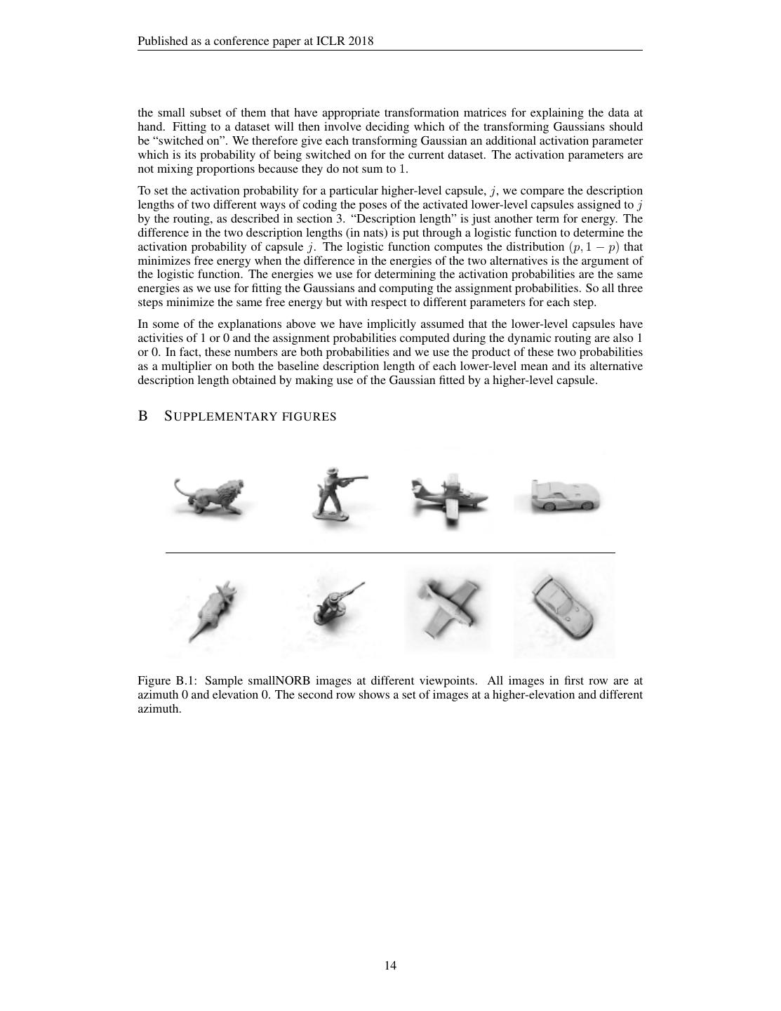 14 .Published as a conference paper at ICLR 2018 the small subset of them that have appropriate transformation matrices for explaining the data at hand. Fitting to a dataset will then involve deciding which of the transforming Gaussians should be “switched on”. We therefore give each transforming Gaussian an additional activation parameter which is its probability of being switched on for the current dataset. The activation parameters are not mixing proportions because they do not sum to 1. To set the activation probability for a particular higher-level capsule, j, we compare the description lengths of two different ways of coding the poses of the activated lower-level capsules assigned to j by the routing, as described in section 3. “Description length” is just another term for energy. The difference in the two description lengths (in nats) is put through a logistic function to determine the activation probability of capsule j. The logistic function computes the distribution (p, 1 − p) that minimizes free energy when the difference in the energies of the two alternatives is the argument of the logistic function. The energies we use for determining the activation probabilities are the same energies as we use for fitting the Gaussians and computing the assignment probabilities. So all three steps minimize the same free energy but with respect to different parameters for each step. In some of the explanations above we have implicitly assumed that the lower-level capsules have activities of 1 or 0 and the assignment probabilities computed during the dynamic routing are also 1 or 0. In fact, these numbers are both probabilities and we use the product of these two probabilities as a multiplier on both the baseline description length of each lower-level mean and its alternative description length obtained by making use of the Gaussian fitted by a higher-level capsule. B S UPPLEMENTARY FIGURES Figure B.1: Sample smallNORB images at different viewpoints. All images in first row are at azimuth 0 and elevation 0. The second row shows a set of images at a higher-elevation and different azimuth. 14