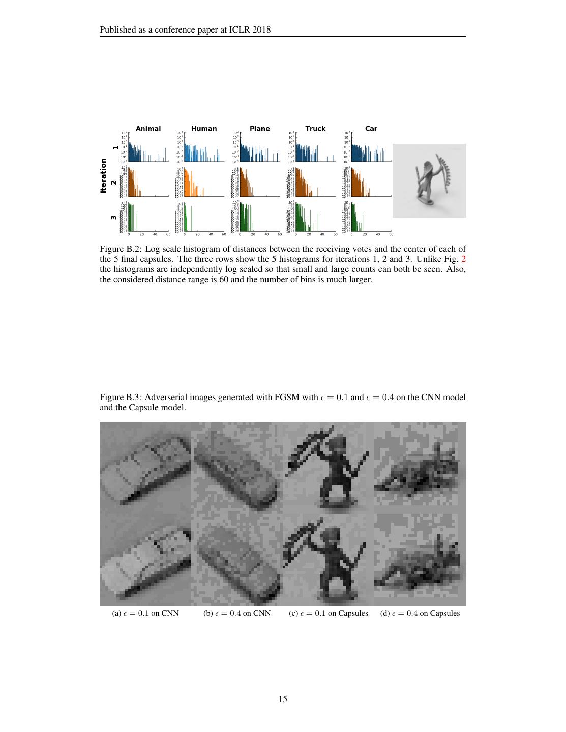 15 .Published as a conference paper at ICLR 2018 Figure B.2: Log scale histogram of distances between the receiving votes and the center of each of the 5 final capsules. The three rows show the 5 histograms for iterations 1, 2 and 3. Unlike Fig. 2 the histograms are independently log scaled so that small and large counts can both be seen. Also, the considered distance range is 60 and the number of bins is much larger. Figure B.3: Adverserial images generated with FGSM with = 0.1 and = 0.4 on the CNN model and the Capsule model. (a) = 0.1 on CNN (b) = 0.4 on CNN (c) = 0.1 on Capsules (d) = 0.4 on Capsules 15