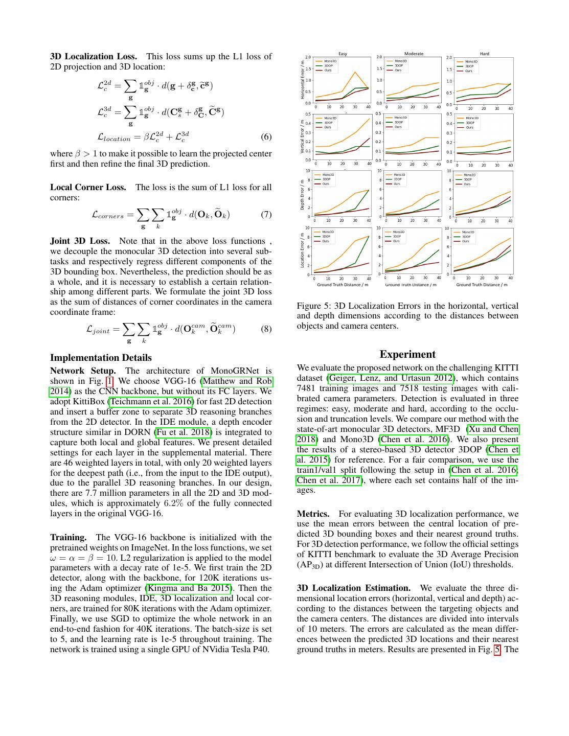 5 . Easy Moderate Hard 3D Localization Loss. This loss sums up the L1 loss of Horizontal Error / m 2D projection and 3D location: L2d c = 1obj g g g · d(g + δc , c ) g g L3d c = 1obj g g g · d(Cs + δC , C ) Vertical Error / m g Llocation = βL2d 3d c + Lc (6) where β > 1 to make it possible to learn the projected center first and then refine the final 3D prediction. Depth Error / m Local Corner Loss. The loss is the sum of L1 loss for all corners: Lcorners = 1obj g · d(Ok , Ok ) (7) g k Location Error / m Joint 3D Loss. Note that in the above loss functions , we decouple the monocular 3D detection into several sub- tasks and respectively regress different components of the 3D bounding box. Nevertheless, the prediction should be as a whole, and it is necessary to establish a certain relation- Ground Truth Distance / m Ground Truth Distance / m Ground Truth Distance / m ship among different parts. We formulate the joint 3D loss as the sum of distances of corner coordinates in the camera Figure 5: 3D Localization Errors in the horizontal, vertical coordinate frame: and depth dimensions according to the distances between Ljoint = 1obj cam , Ocam objects and camera centers. g · d(Ok k ) (8) g k Implementation Details Experiment Network Setup. The architecture of MonoGRNet is We evaluate the proposed network on the challenging KITTI shown in Fig. 1. We choose VGG-16 (Matthew and Rob dataset (Geiger, Lenz, and Urtasun 2012), which contains 2014) as the CNN backbone, but without its FC layers. We 7481 training images and 7518 testing images with cali- adopt KittiBox (Teichmann et al. 2016) for fast 2D detection brated camera parameters. Detection is evaluated in three and insert a buffer zone to separate 3D reasoning branches regimes: easy, moderate and hard, according to the occlu- from the 2D detector. In the IDE module, a depth encoder sion and truncation levels. We compare our method with the structure similar in DORN (Fu et al. 2018) is integrated to state-of-art monocular 3D detectors, MF3D (Xu and Chen capture both local and global features. We present detailed 2018) and Mono3D (Chen et al. 2016). We also present settings for each layer in the supplemental material. There the results of a stereo-based 3D detector 3DOP (Chen et are 46 weighted layers in total, with only 20 weighted layers al. 2015) for reference. For a fair comparison, we use the for the deepest path (i.e., from the input to the IDE output), train1/val1 split following the setup in (Chen et al. 2016; due to the parallel 3D reasoning branches. In our design, Chen et al. 2017), where each set contains half of the im- there are 7.7 million parameters in all the 2D and 3D mod- ages. ules, which is approximately 6.2% of the fully connected layers in the original VGG-16. Metrics. For evaluating 3D localization performance, we use the mean errors between the central location of pre- Training. The VGG-16 backbone is initialized with the dicted 3D bounding boxes and their nearest ground truths. pretrained weights on ImageNet. In the loss functions, we set For 3D detection performance, we follow the official settings ω = α = β = 10. L2 regularization is applied to the model of KITTI benchmark to evaluate the 3D Average Precision parameters with a decay rate of 1e-5. We first train the 2D (AP3D ) at different Intersection of Union (IoU) thresholds. detector, along with the backbone, for 120K iterations us- ing the Adam optimizer (Kingma and Ba 2015). Then the 3D Localization Estimation. We evaluate the three di- 3D reasoning modules, IDE, 3D localization and local cor- mensional location errors (horizontal, vertical and depth) ac- ners, are trained for 80K iterations with the Adam optimizer. cording to the distances between the targeting objects and Finally, we use SGD to optimize the whole network in an the camera centers. The distances are divided into intervals end-to-end fashion for 40K iterations. The batch-size is set of 10 meters. The errors are calculated as the mean differ- to 5, and the learning rate is 1e-5 throughout training. The ences between the predicted 3D locations and their nearest network is trained using a single GPU of NVidia Tesla P40. ground truths in meters. Results are presented in Fig. 5. The