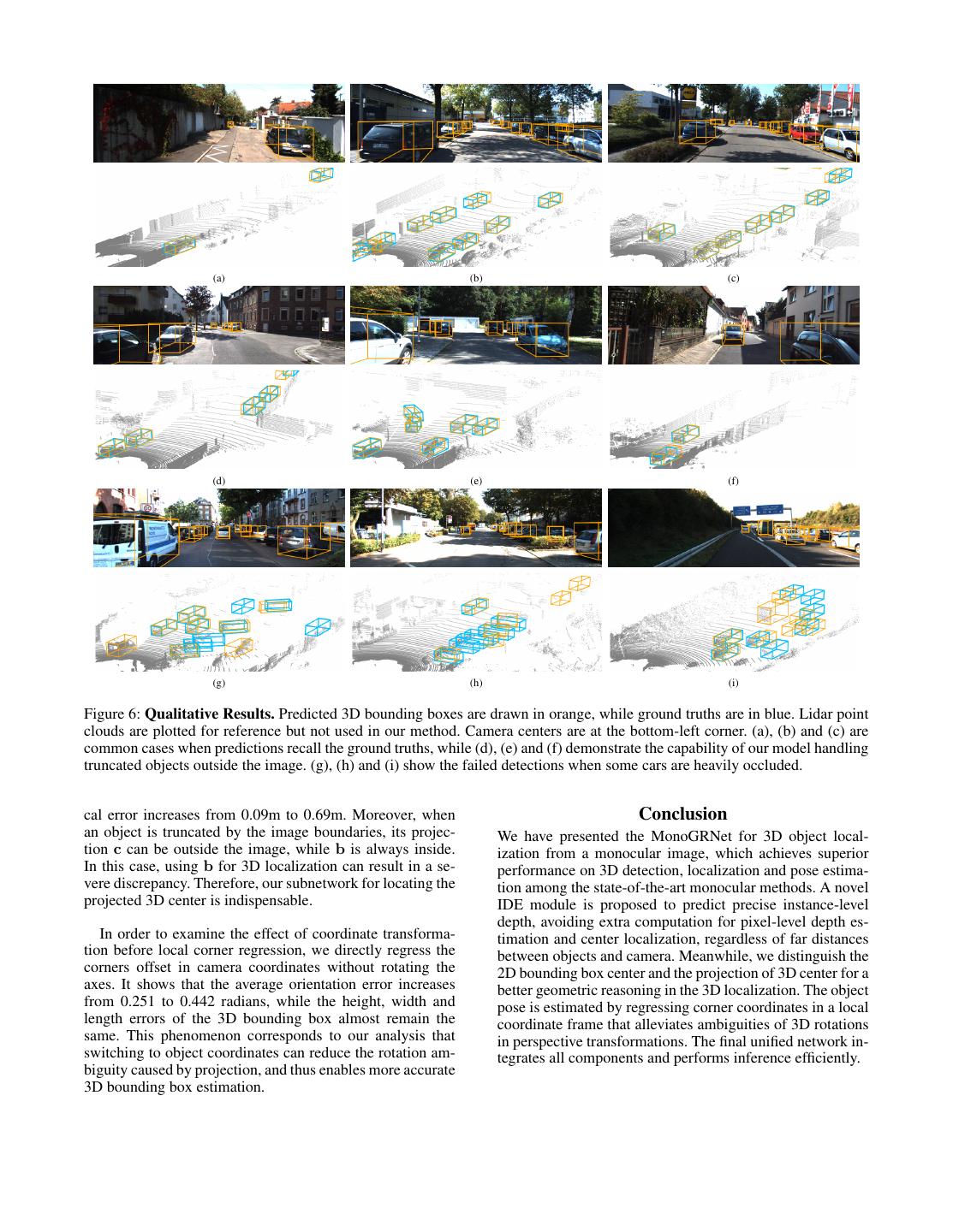 7 . (a) (b) (c) (d) (e) (f) (g) (h) (i) Figure 6: Qualitative Results. Predicted 3D bounding boxes are drawn in orange, while ground truths are in blue. Lidar point clouds are plotted for reference but not used in our method. Camera centers are at the bottom-left corner. (a), (b) and (c) are common cases when predictions recall the ground truths, while (d), (e) and (f) demonstrate the capability of our model handling truncated objects outside the image. (g), (h) and (i) show the failed detections when some cars are heavily occluded. cal error increases from 0.09m to 0.69m. Moreover, when Conclusion an object is truncated by the image boundaries, its projec- We have presented the MonoGRNet for 3D object local- tion c can be outside the image, while b is always inside. ization from a monocular image, which achieves superior In this case, using b for 3D localization can result in a se- performance on 3D detection, localization and pose estima- vere discrepancy. Therefore, our subnetwork for locating the tion among the state-of-the-art monocular methods. A novel projected 3D center is indispensable. IDE module is proposed to predict precise instance-level depth, avoiding extra computation for pixel-level depth es- In order to examine the effect of coordinate transforma- timation and center localization, regardless of far distances tion before local corner regression, we directly regress the between objects and camera. Meanwhile, we distinguish the corners offset in camera coordinates without rotating the 2D bounding box center and the projection of 3D center for a axes. It shows that the average orientation error increases better geometric reasoning in the 3D localization. The object from 0.251 to 0.442 radians, while the height, width and pose is estimated by regressing corner coordinates in a local length errors of the 3D bounding box almost remain the coordinate frame that alleviates ambiguities of 3D rotations same. This phenomenon corresponds to our analysis that in perspective transformations. The final unified network in- switching to object coordinates can reduce the rotation am- tegrates all components and performs inference efficiently. biguity caused by projection, and thus enables more accurate 3D bounding box estimation.
