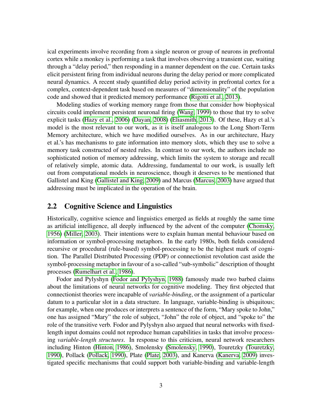 3 .ical experiments involve recording from a single neuron or group of neurons in prefrontal cortex while a monkey is performing a task that involves observing a transient cue, waiting through a “delay period,” then responding in a manner dependent on the cue. Certain tasks elicit persistent firing from individual neurons during the delay period or more complicated neural dynamics. A recent study quantified delay period activity in prefrontal cortex for a complex, context-dependent task based on measures of “dimensionality” of the population code and showed that it predicted memory performance (Rigotti et al., 2013). Modeling studies of working memory range from those that consider how biophysical circuits could implement persistent neuronal firing (Wang, 1999) to those that try to solve explicit tasks (Hazy et al., 2006) (Dayan, 2008) (Eliasmith, 2013). Of these, Hazy et al.’s model is the most relevant to our work, as it is itself analogous to the Long Short-Term Memory architecture, which we have modified ourselves. As in our architecture, Hazy et al.’s has mechanisms to gate information into memory slots, which they use to solve a memory task constructed of nested rules. In contrast to our work, the authors include no sophisticated notion of memory addressing, which limits the system to storage and recall of relatively simple, atomic data. Addressing, fundamental to our work, is usually left out from computational models in neuroscience, though it deserves to be mentioned that Gallistel and King (Gallistel and King, 2009) and Marcus (Marcus, 2003) have argued that addressing must be implicated in the operation of the brain. 2.2 Cognitive Science and Linguistics Historically, cognitive science and linguistics emerged as fields at roughly the same time as artificial intelligence, all deeply influenced by the advent of the computer (Chomsky, 1956) (Miller, 2003). Their intentions were to explain human mental behaviour based on information or symbol-processing metaphors. In the early 1980s, both fields considered recursive or procedural (rule-based) symbol-processing to be the highest mark of cogni- tion. The Parallel Distributed Processing (PDP) or connectionist revolution cast aside the symbol-processing metaphor in favour of a so-called “sub-symbolic” description of thought processes (Rumelhart et al., 1986). Fodor and Pylyshyn (Fodor and Pylyshyn, 1988) famously made two barbed claims about the limitations of neural networks for cognitive modeling. They first objected that connectionist theories were incapable of variable-binding, or the assignment of a particular datum to a particular slot in a data structure. In language, variable-binding is ubiquitous; for example, when one produces or interprets a sentence of the form, “Mary spoke to John,” one has assigned “Mary” the role of subject, “John” the role of object, and “spoke to” the role of the transitive verb. Fodor and Pylyshyn also argued that neural networks with fixed- length input domains could not reproduce human capabilities in tasks that involve process- ing variable-length structures. In response to this criticism, neural network researchers including Hinton (Hinton, 1986), Smolensky (Smolensky, 1990), Touretzky (Touretzky, 1990), Pollack (Pollack, 1990), Plate (Plate, 2003), and Kanerva (Kanerva, 2009) inves- tigated specific mechanisms that could support both variable-binding and variable-length 3