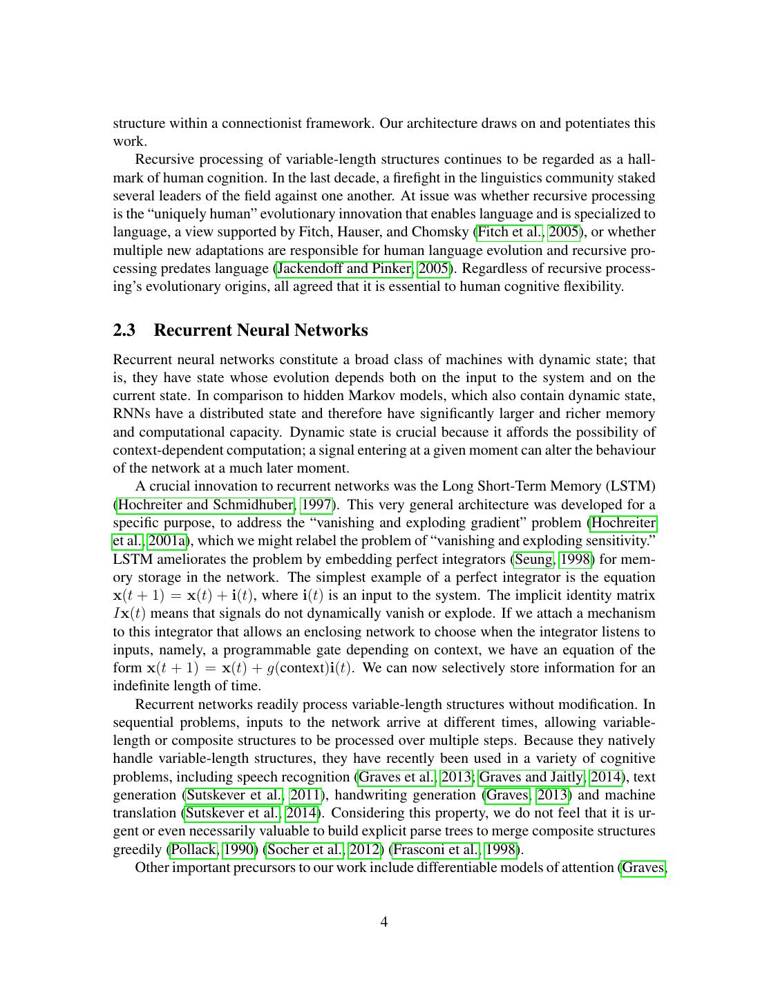 4 .structure within a connectionist framework. Our architecture draws on and potentiates this work. Recursive processing of variable-length structures continues to be regarded as a hall- mark of human cognition. In the last decade, a firefight in the linguistics community staked several leaders of the field against one another. At issue was whether recursive processing is the “uniquely human” evolutionary innovation that enables language and is specialized to language, a view supported by Fitch, Hauser, and Chomsky (Fitch et al., 2005), or whether multiple new adaptations are responsible for human language evolution and recursive pro- cessing predates language (Jackendoff and Pinker, 2005). Regardless of recursive process- ing’s evolutionary origins, all agreed that it is essential to human cognitive flexibility. 2.3 Recurrent Neural Networks Recurrent neural networks constitute a broad class of machines with dynamic state; that is, they have state whose evolution depends both on the input to the system and on the current state. In comparison to hidden Markov models, which also contain dynamic state, RNNs have a distributed state and therefore have significantly larger and richer memory and computational capacity. Dynamic state is crucial because it affords the possibility of context-dependent computation; a signal entering at a given moment can alter the behaviour of the network at a much later moment. A crucial innovation to recurrent networks was the Long Short-Term Memory (LSTM) (Hochreiter and Schmidhuber, 1997). This very general architecture was developed for a specific purpose, to address the “vanishing and exploding gradient” problem (Hochreiter et al., 2001a), which we might relabel the problem of “vanishing and exploding sensitivity.” LSTM ameliorates the problem by embedding perfect integrators (Seung, 1998) for mem- ory storage in the network. The simplest example of a perfect integrator is the equation x(t + 1) = x(t) + i(t), where i(t) is an input to the system. The implicit identity matrix Ix(t) means that signals do not dynamically vanish or explode. If we attach a mechanism to this integrator that allows an enclosing network to choose when the integrator listens to inputs, namely, a programmable gate depending on context, we have an equation of the form x(t + 1) = x(t) + g(context)i(t). We can now selectively store information for an indefinite length of time. Recurrent networks readily process variable-length structures without modification. In sequential problems, inputs to the network arrive at different times, allowing variable- length or composite structures to be processed over multiple steps. Because they natively handle variable-length structures, they have recently been used in a variety of cognitive problems, including speech recognition (Graves et al., 2013; Graves and Jaitly, 2014), text generation (Sutskever et al., 2011), handwriting generation (Graves, 2013) and machine translation (Sutskever et al., 2014). Considering this property, we do not feel that it is ur- gent or even necessarily valuable to build explicit parse trees to merge composite structures greedily (Pollack, 1990) (Socher et al., 2012) (Frasconi et al., 1998). Other important precursors to our work include differentiable models of attention (Graves, 4