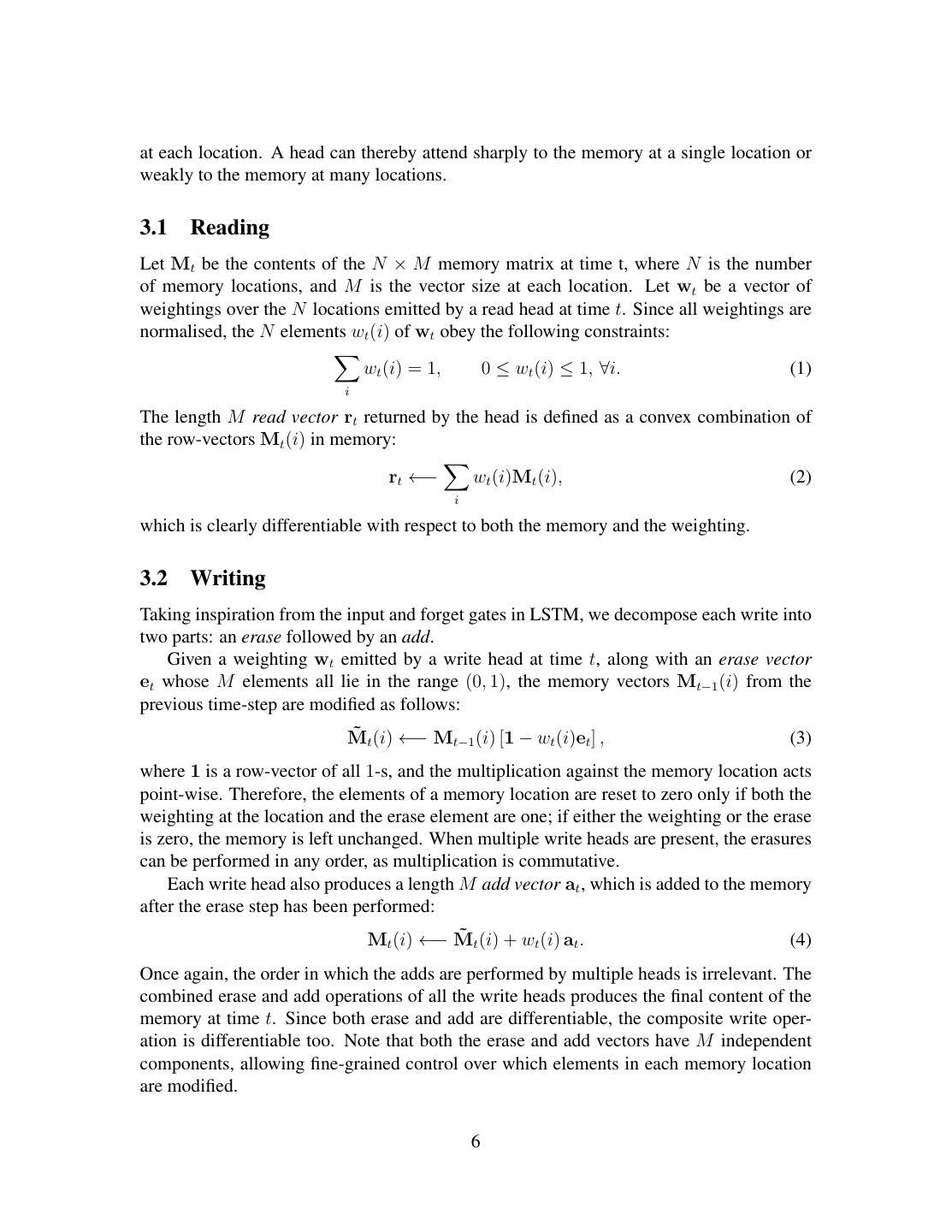 6 .at each location. A head can thereby attend sharply to the memory at a single location or weakly to the memory at many locations. 3.1 Reading Let Mt be the contents of the N × M memory matrix at time t, where N is the number of memory locations, and M is the vector size at each location. Let wt be a vector of weightings over the N locations emitted by a read head at time t. Since all weightings are normalised, the N elements wt (i) of wt obey the following constraints: wt (i) = 1, 0 ≤ wt (i) ≤ 1, ∀i. (1) i The length M read vector rt returned by the head is defined as a convex combination of the row-vectors Mt (i) in memory: rt ←− wt (i)Mt (i), (2) i which is clearly differentiable with respect to both the memory and the weighting. 3.2 Writing Taking inspiration from the input and forget gates in LSTM, we decompose each write into two parts: an erase followed by an add. Given a weighting wt emitted by a write head at time t, along with an erase vector et whose M elements all lie in the range (0, 1), the memory vectors Mt−1 (i) from the previous time-step are modified as follows: ˜ t (i) ←− Mt−1 (i) [1 − wt (i)et ] , M (3) where 1 is a row-vector of all 1-s, and the multiplication against the memory location acts point-wise. Therefore, the elements of a memory location are reset to zero only if both the weighting at the location and the erase element are one; if either the weighting or the erase is zero, the memory is left unchanged. When multiple write heads are present, the erasures can be performed in any order, as multiplication is commutative. Each write head also produces a length M add vector at , which is added to the memory after the erase step has been performed: ˜ t (i) + wt (i) at . Mt (i) ←− M (4) Once again, the order in which the adds are performed by multiple heads is irrelevant. The combined erase and add operations of all the write heads produces the final content of the memory at time t. Since both erase and add are differentiable, the composite write oper- ation is differentiable too. Note that both the erase and add vectors have M independent components, allowing fine-grained control over which elements in each memory location are modified. 6
