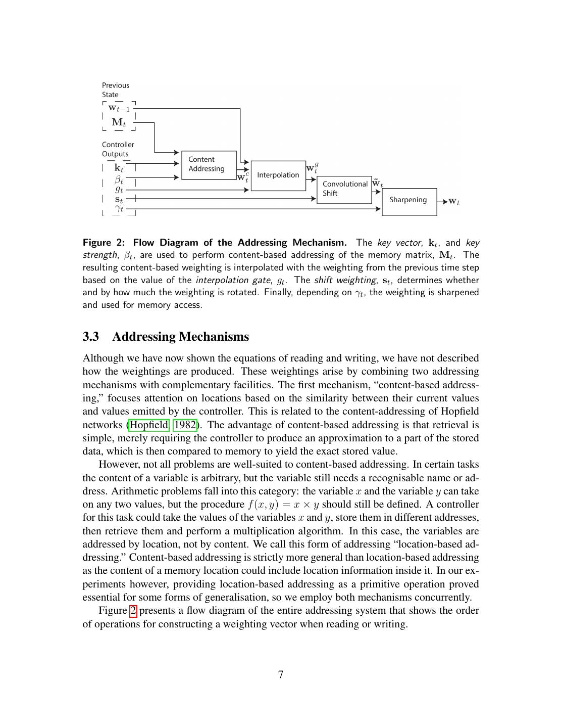 7 .Figure 2: Flow Diagram of the Addressing Mechanism. The key vector, kt , and key strength, βt , are used to perform content-based addressing of the memory matrix, Mt . The resulting content-based weighting is interpolated with the weighting from the previous time step based on the value of the interpolation gate, gt . The shift weighting, st , determines whether and by how much the weighting is rotated. Finally, depending on γt , the weighting is sharpened and used for memory access. 3.3 Addressing Mechanisms Although we have now shown the equations of reading and writing, we have not described how the weightings are produced. These weightings arise by combining two addressing mechanisms with complementary facilities. The first mechanism, “content-based address- ing,” focuses attention on locations based on the similarity between their current values and values emitted by the controller. This is related to the content-addressing of Hopfield networks (Hopfield, 1982). The advantage of content-based addressing is that retrieval is simple, merely requiring the controller to produce an approximation to a part of the stored data, which is then compared to memory to yield the exact stored value. However, not all problems are well-suited to content-based addressing. In certain tasks the content of a variable is arbitrary, but the variable still needs a recognisable name or ad- dress. Arithmetic problems fall into this category: the variable x and the variable y can take on any two values, but the procedure f (x, y) = x × y should still be defined. A controller for this task could take the values of the variables x and y, store them in different addresses, then retrieve them and perform a multiplication algorithm. In this case, the variables are addressed by location, not by content. We call this form of addressing “location-based ad- dressing.” Content-based addressing is strictly more general than location-based addressing as the content of a memory location could include location information inside it. In our ex- periments however, providing location-based addressing as a primitive operation proved essential for some forms of generalisation, so we employ both mechanisms concurrently. Figure 2 presents a flow diagram of the entire addressing system that shows the order of operations for constructing a weighting vector when reading or writing. 7