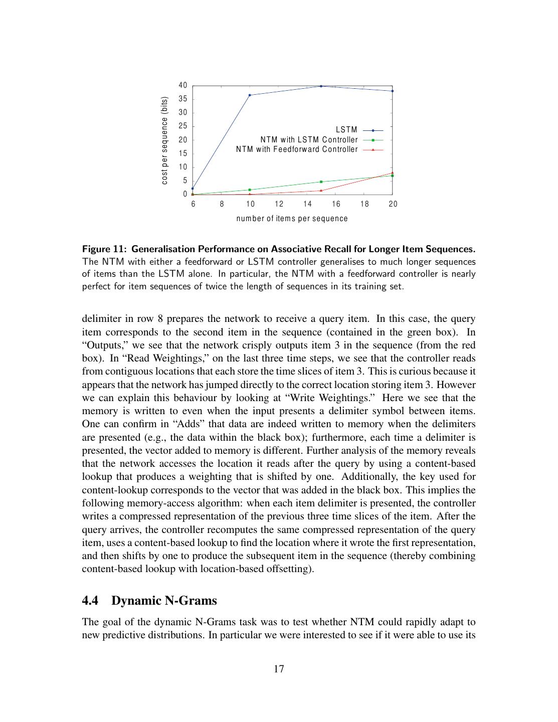 17 . 40 35 co st p er seq u en ce (bits) 30 25 LS T M 20 N T M w ith LS T M C o ntroller 15 N T M w ith F eed fo rw a rd C o n troller 10 5 0 6 8 10 12 14 16 18 20 n um be r of item s per se que nce Figure 11: Generalisation Performance on Associative Recall for Longer Item Sequences. The NTM with either a feedforward or LSTM controller generalises to much longer sequences of items than the LSTM alone. In particular, the NTM with a feedforward controller is nearly perfect for item sequences of twice the length of sequences in its training set. delimiter in row 8 prepares the network to receive a query item. In this case, the query item corresponds to the second item in the sequence (contained in the green box). In “Outputs,” we see that the network crisply outputs item 3 in the sequence (from the red box). In “Read Weightings,” on the last three time steps, we see that the controller reads from contiguous locations that each store the time slices of item 3. This is curious because it appears that the network has jumped directly to the correct location storing item 3. However we can explain this behaviour by looking at “Write Weightings.” Here we see that the memory is written to even when the input presents a delimiter symbol between items. One can confirm in “Adds” that data are indeed written to memory when the delimiters are presented (e.g., the data within the black box); furthermore, each time a delimiter is presented, the vector added to memory is different. Further analysis of the memory reveals that the network accesses the location it reads after the query by using a content-based lookup that produces a weighting that is shifted by one. Additionally, the key used for content-lookup corresponds to the vector that was added in the black box. This implies the following memory-access algorithm: when each item delimiter is presented, the controller writes a compressed representation of the previous three time slices of the item. After the query arrives, the controller recomputes the same compressed representation of the query item, uses a content-based lookup to find the location where it wrote the first representation, and then shifts by one to produce the subsequent item in the sequence (thereby combining content-based lookup with location-based offsetting). 4.4 Dynamic N-Grams The goal of the dynamic N-Grams task was to test whether NTM could rapidly adapt to new predictive distributions. In particular we were interested to see if it were able to use its 17