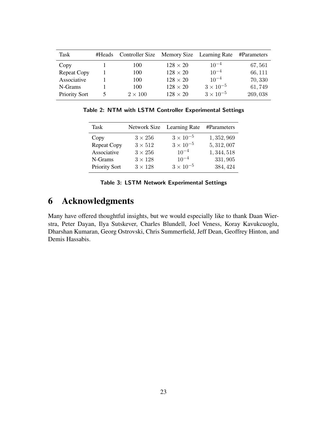 23 . Task #Heads Controller Size Memory Size Learning Rate #Parameters Copy 1 100 128 × 20 10−4 67, 561 Repeat Copy 1 100 128 × 20 10−4 66, 111 Associative 1 100 128 × 20 10−4 70, 330 N-Grams 1 100 128 × 20 3 × 10−5 61, 749 Priority Sort 5 2 × 100 128 × 20 3 × 10−5 269, 038 Table 2: NTM with LSTM Controller Experimental Settings Task Network Size Learning Rate #Parameters Copy 3 × 256 3 × 10−5 1, 352, 969 Repeat Copy 3 × 512 3 × 10−5 5, 312, 007 Associative 3 × 256 10−4 1, 344, 518 N-Grams 3 × 128 10−4 331, 905 Priority Sort 3 × 128 3 × 10−5 384, 424 Table 3: LSTM Network Experimental Settings 6 Acknowledgments Many have offered thoughtful insights, but we would especially like to thank Daan Wier- stra, Peter Dayan, Ilya Sutskever, Charles Blundell, Joel Veness, Koray Kavukcuoglu, Dharshan Kumaran, Georg Ostrovski, Chris Summerfield, Jeff Dean, Geoffrey Hinton, and Demis Hassabis. 23