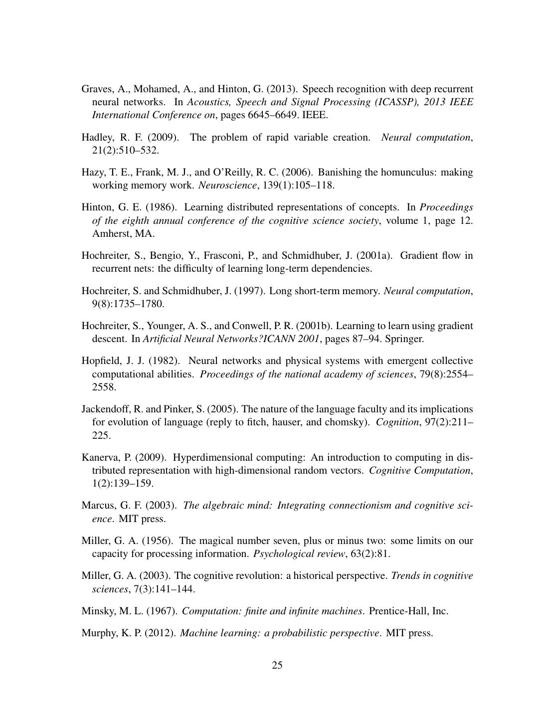 25 .Graves, A., Mohamed, A., and Hinton, G. (2013). Speech recognition with deep recurrent neural networks. In Acoustics, Speech and Signal Processing (ICASSP), 2013 IEEE International Conference on, pages 6645–6649. IEEE. Hadley, R. F. (2009). The problem of rapid variable creation. Neural computation, 21(2):510–532. Hazy, T. E., Frank, M. J., and O’Reilly, R. C. (2006). Banishing the homunculus: making working memory work. Neuroscience, 139(1):105–118. Hinton, G. E. (1986). Learning distributed representations of concepts. In Proceedings of the eighth annual conference of the cognitive science society, volume 1, page 12. Amherst, MA. Hochreiter, S., Bengio, Y., Frasconi, P., and Schmidhuber, J. (2001a). Gradient flow in recurrent nets: the difficulty of learning long-term dependencies. Hochreiter, S. and Schmidhuber, J. (1997). Long short-term memory. Neural computation, 9(8):1735–1780. Hochreiter, S., Younger, A. S., and Conwell, P. R. (2001b). Learning to learn using gradient descent. In Artificial Neural Networks?ICANN 2001, pages 87–94. Springer. Hopfield, J. J. (1982). Neural networks and physical systems with emergent collective computational abilities. Proceedings of the national academy of sciences, 79(8):2554– 2558. Jackendoff, R. and Pinker, S. (2005). The nature of the language faculty and its implications for evolution of language (reply to fitch, hauser, and chomsky). Cognition, 97(2):211– 225. Kanerva, P. (2009). Hyperdimensional computing: An introduction to computing in dis- tributed representation with high-dimensional random vectors. Cognitive Computation, 1(2):139–159. Marcus, G. F. (2003). The algebraic mind: Integrating connectionism and cognitive sci- ence. MIT press. Miller, G. A. (1956). The magical number seven, plus or minus two: some limits on our capacity for processing information. Psychological review, 63(2):81. Miller, G. A. (2003). The cognitive revolution: a historical perspective. Trends in cognitive sciences, 7(3):141–144. Minsky, M. L. (1967). Computation: finite and infinite machines. Prentice-Hall, Inc. Murphy, K. P. (2012). Machine learning: a probabilistic perspective. MIT press. 25