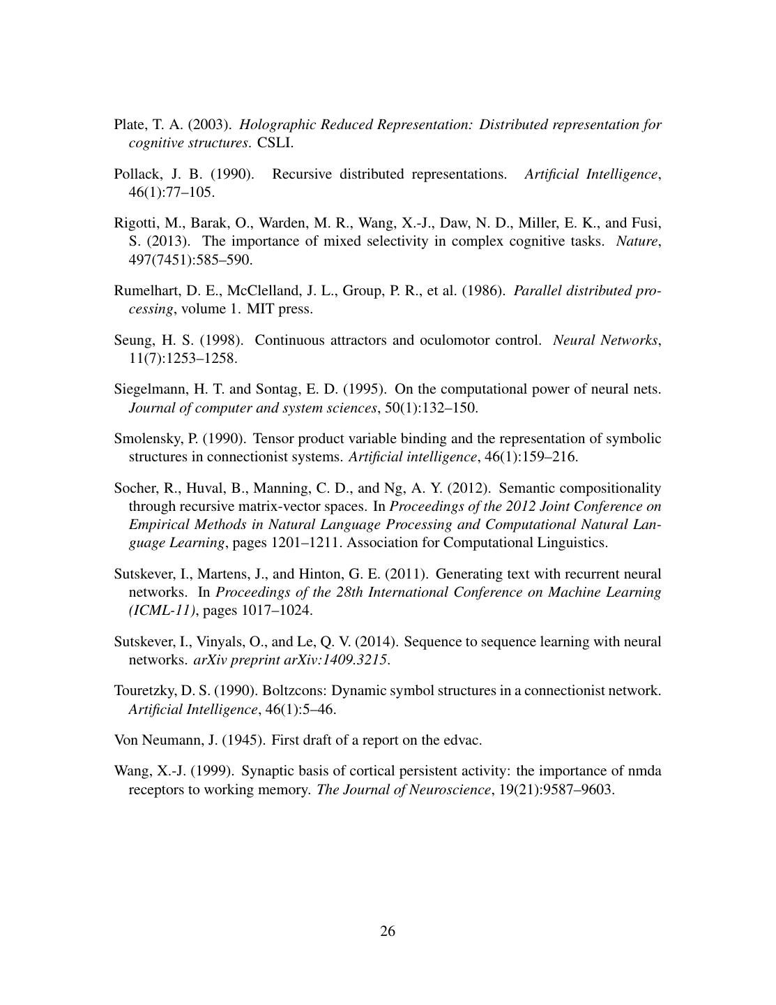 26 .Plate, T. A. (2003). Holographic Reduced Representation: Distributed representation for cognitive structures. CSLI. Pollack, J. B. (1990). Recursive distributed representations. Artificial Intelligence, 46(1):77–105. Rigotti, M., Barak, O., Warden, M. R., Wang, X.-J., Daw, N. D., Miller, E. K., and Fusi, S. (2013). The importance of mixed selectivity in complex cognitive tasks. Nature, 497(7451):585–590. Rumelhart, D. E., McClelland, J. L., Group, P. R., et al. (1986). Parallel distributed pro- cessing, volume 1. MIT press. Seung, H. S. (1998). Continuous attractors and oculomotor control. Neural Networks, 11(7):1253–1258. Siegelmann, H. T. and Sontag, E. D. (1995). On the computational power of neural nets. Journal of computer and system sciences, 50(1):132–150. Smolensky, P. (1990). Tensor product variable binding and the representation of symbolic structures in connectionist systems. Artificial intelligence, 46(1):159–216. Socher, R., Huval, B., Manning, C. D., and Ng, A. Y. (2012). Semantic compositionality through recursive matrix-vector spaces. In Proceedings of the 2012 Joint Conference on Empirical Methods in Natural Language Processing and Computational Natural Lan- guage Learning, pages 1201–1211. Association for Computational Linguistics. Sutskever, I., Martens, J., and Hinton, G. E. (2011). Generating text with recurrent neural networks. In Proceedings of the 28th International Conference on Machine Learning (ICML-11), pages 1017–1024. Sutskever, I., Vinyals, O., and Le, Q. V. (2014). Sequence to sequence learning with neural networks. arXiv preprint arXiv:1409.3215. Touretzky, D. S. (1990). Boltzcons: Dynamic symbol structures in a connectionist network. Artificial Intelligence, 46(1):5–46. Von Neumann, J. (1945). First draft of a report on the edvac. Wang, X.-J. (1999). Synaptic basis of cortical persistent activity: the importance of nmda receptors to working memory. The Journal of Neuroscience, 19(21):9587–9603. 26