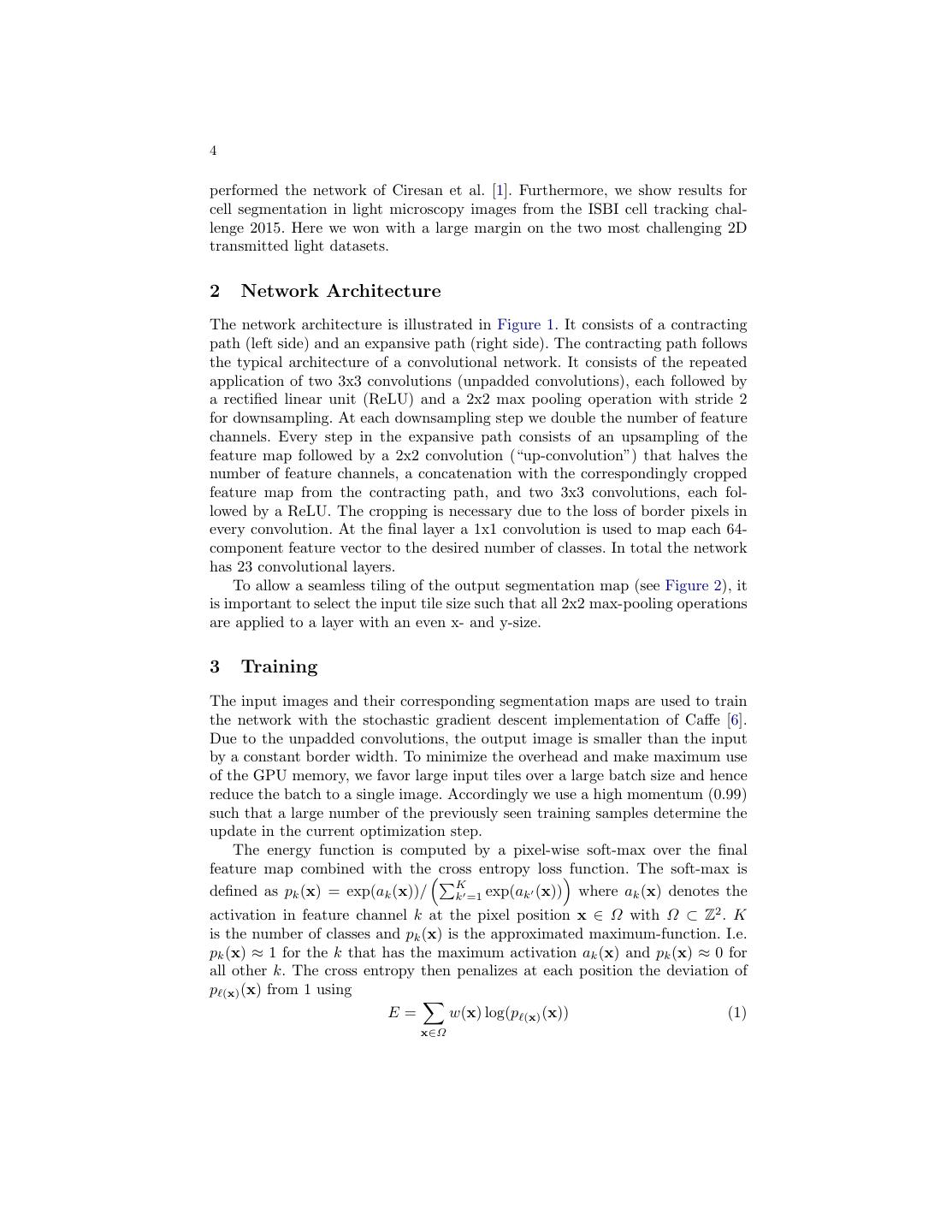 4 .4 performed the network of Ciresan et al. [1]. Furthermore, we show results for cell segmentation in light microscopy images from the ISBI cell tracking chal- lenge 2015. Here we won with a large margin on the two most challenging 2D transmitted light datasets. 2 Network Architecture The network architecture is illustrated in Figure 1. It consists of a contracting path (left side) and an expansive path (right side). The contracting path follows the typical architecture of a convolutional network. It consists of the repeated application of two 3x3 convolutions (unpadded convolutions), each followed by a rectified linear unit (ReLU) and a 2x2 max pooling operation with stride 2 for downsampling. At each downsampling step we double the number of feature channels. Every step in the expansive path consists of an upsampling of the feature map followed by a 2x2 convolution (“up-convolution”) that halves the number of feature channels, a concatenation with the correspondingly cropped feature map from the contracting path, and two 3x3 convolutions, each fol- lowed by a ReLU. The cropping is necessary due to the loss of border pixels in every convolution. At the final layer a 1x1 convolution is used to map each 64- component feature vector to the desired number of classes. In total the network has 23 convolutional layers. To allow a seamless tiling of the output segmentation map (see Figure 2), it is important to select the input tile size such that all 2x2 max-pooling operations are applied to a layer with an even x- and y-size. 3 Training The input images and their corresponding segmentation maps are used to train the network with the stochastic gradient descent implementation of Caffe [6]. Due to the unpadded convolutions, the output image is smaller than the input by a constant border width. To minimize the overhead and make maximum use of the GPU memory, we favor large input tiles over a large batch size and hence reduce the batch to a single image. Accordingly we use a high momentum (0.99) such that a large number of the previously seen training samples determine the update in the current optimization step. The energy function is computed by a pixel-wise soft-max over the final feature map combined with the cross entropy loss function. The soft-max is K defined as pk (x) = exp(ak (x))/ k =1 exp(ak (x)) where ak (x) denotes the activation in feature channel k at the pixel position x ∈ Ω with Ω ⊂ Z2 . K is the number of classes and pk (x) is the approximated maximum-function. I.e. pk (x) ≈ 1 for the k that has the maximum activation ak (x) and pk (x) ≈ 0 for all other k. The cross entropy then penalizes at each position the deviation of p (x) (x) from 1 using E= w(x) log(p (x) (x)) (1) x∈Ω
