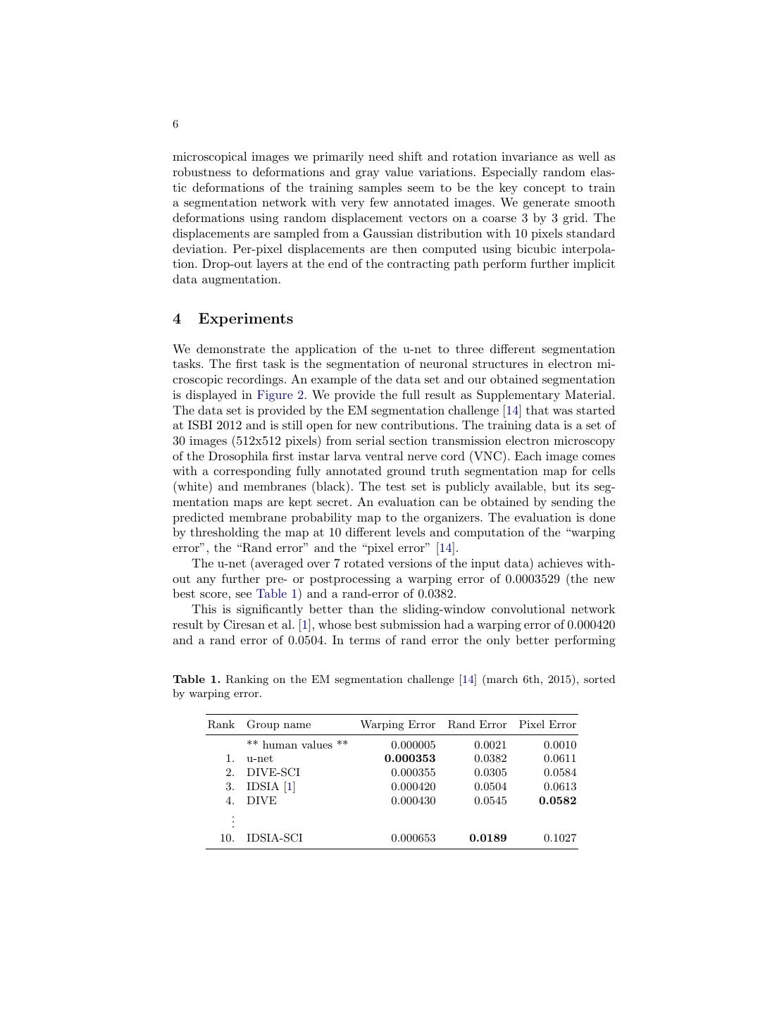 6 .6 microscopical images we primarily need shift and rotation invariance as well as robustness to deformations and gray value variations. Especially random elas- tic deformations of the training samples seem to be the key concept to train a segmentation network with very few annotated images. We generate smooth deformations using random displacement vectors on a coarse 3 by 3 grid. The displacements are sampled from a Gaussian distribution with 10 pixels standard deviation. Per-pixel displacements are then computed using bicubic interpola- tion. Drop-out layers at the end of the contracting path perform further implicit data augmentation. 4 Experiments We demonstrate the application of the u-net to three different segmentation tasks. The first task is the segmentation of neuronal structures in electron mi- croscopic recordings. An example of the data set and our obtained segmentation is displayed in Figure 2. We provide the full result as Supplementary Material. The data set is provided by the EM segmentation challenge [14] that was started at ISBI 2012 and is still open for new contributions. The training data is a set of 30 images (512x512 pixels) from serial section transmission electron microscopy of the Drosophila first instar larva ventral nerve cord (VNC). Each image comes with a corresponding fully annotated ground truth segmentation map for cells (white) and membranes (black). The test set is publicly available, but its seg- mentation maps are kept secret. An evaluation can be obtained by sending the predicted membrane probability map to the organizers. The evaluation is done by thresholding the map at 10 different levels and computation of the “warping error”, the “Rand error” and the “pixel error” [14]. The u-net (averaged over 7 rotated versions of the input data) achieves with- out any further pre- or postprocessing a warping error of 0.0003529 (the new best score, see Table 1) and a rand-error of 0.0382. This is significantly better than the sliding-window convolutional network result by Ciresan et al. [1], whose best submission had a warping error of 0.000420 and a rand error of 0.0504. In terms of rand error the only better performing Table 1. Ranking on the EM segmentation challenge [14] (march 6th, 2015), sorted by warping error. Rank Group name Warping Error Rand Error Pixel Error ** human values ** 0.000005 0.0021 0.0010 1. u-net 0.000353 0.0382 0.0611 2. DIVE-SCI 0.000355 0.0305 0.0584 3. IDSIA [1] 0.000420 0.0504 0.0613 4. DIVE 0.000430 0.0545 0.0582 .. . 10. IDSIA-SCI 0.000653 0.0189 0.1027