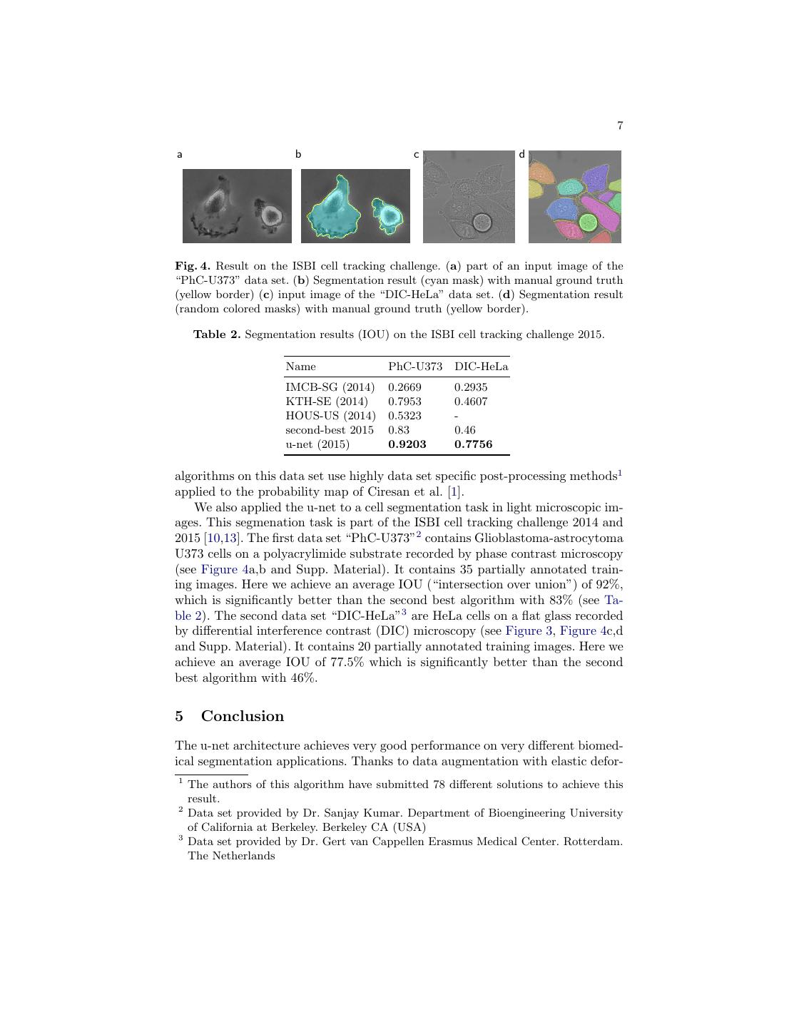 7 . 7 a b c d Fig. 4. Result on the ISBI cell tracking challenge. (a) part of an input image of the “PhC-U373” data set. (b) Segmentation result (cyan mask) with manual ground truth (yellow border) (c) input image of the “DIC-HeLa” data set. (d) Segmentation result (random colored masks) with manual ground truth (yellow border). Table 2. Segmentation results (IOU) on the ISBI cell tracking challenge 2015. Name PhC-U373 DIC-HeLa IMCB-SG (2014) 0.2669 0.2935 KTH-SE (2014) 0.7953 0.4607 HOUS-US (2014) 0.5323 - second-best 2015 0.83 0.46 u-net (2015) 0.9203 0.7756 algorithms on this data set use highly data set specific post-processing methods1 applied to the probability map of Ciresan et al. [1]. We also applied the u-net to a cell segmentation task in light microscopic im- ages. This segmenation task is part of the ISBI cell tracking challenge 2014 and 2015 [10,13]. The first data set “PhC-U373”2 contains Glioblastoma-astrocytoma U373 cells on a polyacrylimide substrate recorded by phase contrast microscopy (see Figure 4a,b and Supp. Material). It contains 35 partially annotated train- ing images. Here we achieve an average IOU (“intersection over union”) of 92%, which is significantly better than the second best algorithm with 83% (see Ta- ble 2). The second data set “DIC-HeLa”3 are HeLa cells on a flat glass recorded by differential interference contrast (DIC) microscopy (see Figure 3, Figure 4c,d and Supp. Material). It contains 20 partially annotated training images. Here we achieve an average IOU of 77.5% which is significantly better than the second best algorithm with 46%. 5 Conclusion The u-net architecture achieves very good performance on very different biomed- ical segmentation applications. Thanks to data augmentation with elastic defor- 1 The authors of this algorithm have submitted 78 different solutions to achieve this result. 2 Data set provided by Dr. Sanjay Kumar. Department of Bioengineering University of California at Berkeley. Berkeley CA (USA) 3 Data set provided by Dr. Gert van Cappellen Erasmus Medical Center. Rotterdam. The Netherlands