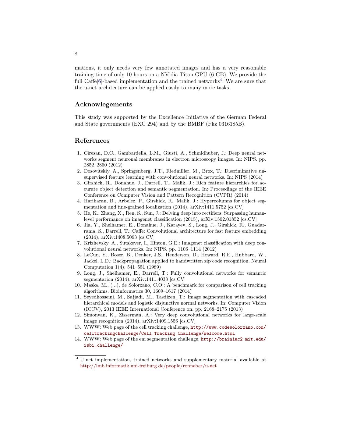 8 .8 mations, it only needs very few annotated images and has a very reasonable training time of only 10 hours on a NVidia Titan GPU (6 GB). We provide the full Caffe[6]-based implementation and the trained networks4 . We are sure that the u-net architecture can be applied easily to many more tasks. Acknowlegements This study was supported by the Excellence Initiative of the German Federal and State governments (EXC 294) and by the BMBF (Fkz 0316185B). References 1. Ciresan, D.C., Gambardella, L.M., Giusti, A., Schmidhuber, J.: Deep neural net- works segment neuronal membranes in electron microscopy images. In: NIPS. pp. 2852–2860 (2012) 2. Dosovitskiy, A., Springenberg, J.T., Riedmiller, M., Brox, T.: Discriminative un- supervised feature learning with convolutional neural networks. In: NIPS (2014) 3. Girshick, R., Donahue, J., Darrell, T., Malik, J.: Rich feature hierarchies for ac- curate object detection and semantic segmentation. In: Proceedings of the IEEE Conference on Computer Vision and Pattern Recognition (CVPR) (2014) 4. Hariharan, B., Arbelez, P., Girshick, R., Malik, J.: Hypercolumns for object seg- mentation and fine-grained localization (2014), arXiv:1411.5752 [cs.CV] 5. He, K., Zhang, X., Ren, S., Sun, J.: Delving deep into rectifiers: Surpassing human- level performance on imagenet classification (2015), arXiv:1502.01852 [cs.CV] 6. Jia, Y., Shelhamer, E., Donahue, J., Karayev, S., Long, J., Girshick, R., Guadar- rama, S., Darrell, T.: Caffe: Convolutional architecture for fast feature embedding (2014), arXiv:1408.5093 [cs.CV] 7. Krizhevsky, A., Sutskever, I., Hinton, G.E.: Imagenet classification with deep con- volutional neural networks. In: NIPS. pp. 1106–1114 (2012) 8. LeCun, Y., Boser, B., Denker, J.S., Henderson, D., Howard, R.E., Hubbard, W., Jackel, L.D.: Backpropagation applied to handwritten zip code recognition. Neural Computation 1(4), 541–551 (1989) 9. Long, J., Shelhamer, E., Darrell, T.: Fully convolutional networks for semantic segmentation (2014), arXiv:1411.4038 [cs.CV] 10. Maska, M., (...), de Solorzano, C.O.: A benchmark for comparison of cell tracking algorithms. Bioinformatics 30, 1609–1617 (2014) 11. Seyedhosseini, M., Sajjadi, M., Tasdizen, T.: Image segmentation with cascaded hierarchical models and logistic disjunctive normal networks. In: Computer Vision (ICCV), 2013 IEEE International Conference on. pp. 2168–2175 (2013) 12. Simonyan, K., Zisserman, A.: Very deep convolutional networks for large-scale image recognition (2014), arXiv:1409.1556 [cs.CV] 13. WWW: Web page of the cell tracking challenge, http://www.codesolorzano.com/ celltrackingchallenge/Cell_Tracking_Challenge/Welcome.html 14. WWW: Web page of the em segmentation challenge, http://brainiac2.mit.edu/ isbi_challenge/ 4 U-net implementation, trained networks and supplementary material available at http://lmb.informatik.uni-freiburg.de/people/ronneber/u-net