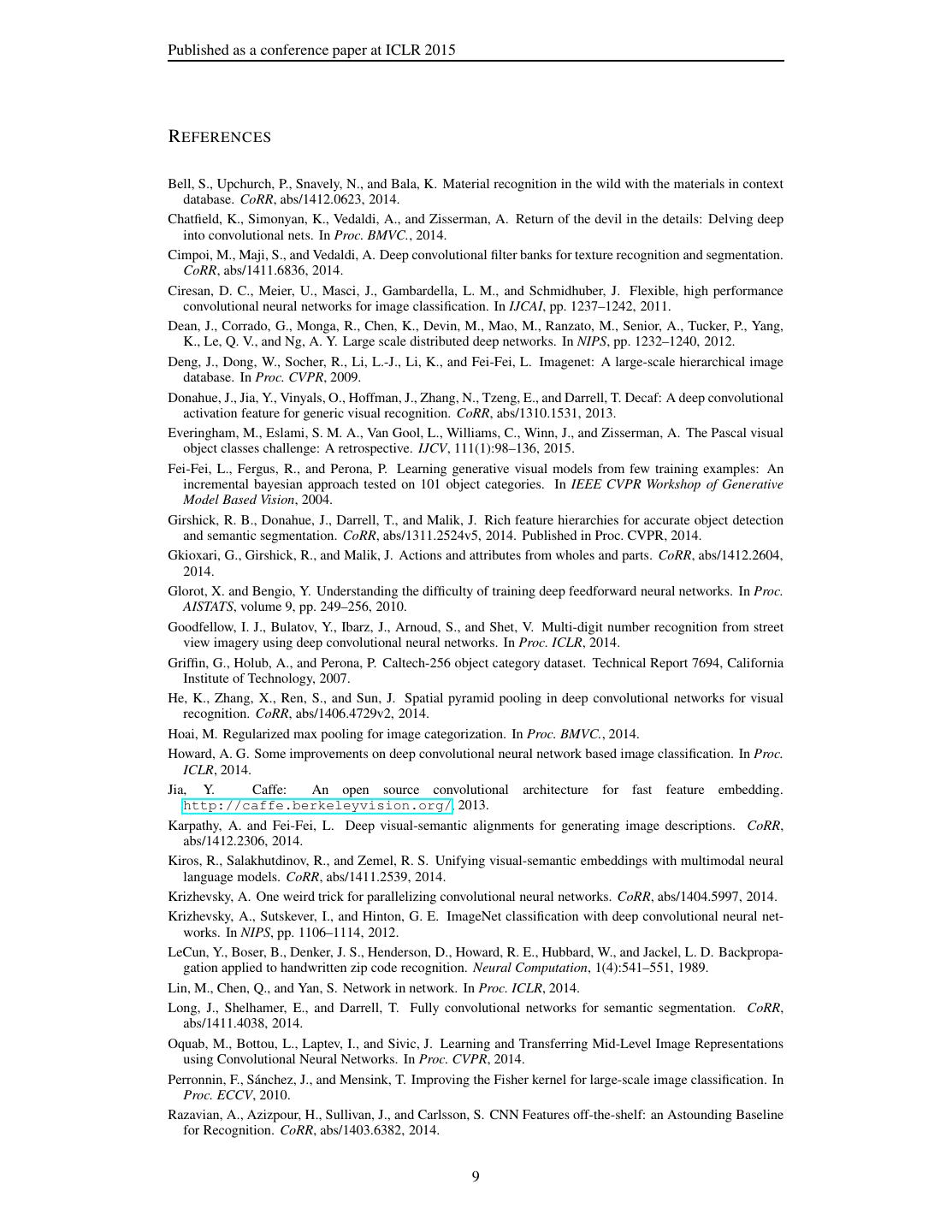 9 .Published as a conference paper at ICLR 2015 R EFERENCES Bell, S., Upchurch, P., Snavely, N., and Bala, K. Material recognition in the wild with the materials in context database. CoRR, abs/1412.0623, 2014. Chatfield, K., Simonyan, K., Vedaldi, A., and Zisserman, A. Return of the devil in the details: Delving deep into convolutional nets. In Proc. BMVC., 2014. Cimpoi, M., Maji, S., and Vedaldi, A. Deep convolutional filter banks for texture recognition and segmentation. CoRR, abs/1411.6836, 2014. Ciresan, D. C., Meier, U., Masci, J., Gambardella, L. M., and Schmidhuber, J. Flexible, high performance convolutional neural networks for image classification. In IJCAI, pp. 1237–1242, 2011. Dean, J., Corrado, G., Monga, R., Chen, K., Devin, M., Mao, M., Ranzato, M., Senior, A., Tucker, P., Yang, K., Le, Q. V., and Ng, A. Y. Large scale distributed deep networks. In NIPS, pp. 1232–1240, 2012. Deng, J., Dong, W., Socher, R., Li, L.-J., Li, K., and Fei-Fei, L. Imagenet: A large-scale hierarchical image database. In Proc. CVPR, 2009. Donahue, J., Jia, Y., Vinyals, O., Hoffman, J., Zhang, N., Tzeng, E., and Darrell, T. Decaf: A deep convolutional activation feature for generic visual recognition. CoRR, abs/1310.1531, 2013. Everingham, M., Eslami, S. M. A., Van Gool, L., Williams, C., Winn, J., and Zisserman, A. The Pascal visual object classes challenge: A retrospective. IJCV, 111(1):98–136, 2015. Fei-Fei, L., Fergus, R., and Perona, P. Learning generative visual models from few training examples: An incremental bayesian approach tested on 101 object categories. In IEEE CVPR Workshop of Generative Model Based Vision, 2004. Girshick, R. B., Donahue, J., Darrell, T., and Malik, J. Rich feature hierarchies for accurate object detection and semantic segmentation. CoRR, abs/1311.2524v5, 2014. Published in Proc. CVPR, 2014. Gkioxari, G., Girshick, R., and Malik, J. Actions and attributes from wholes and parts. CoRR, abs/1412.2604, 2014. Glorot, X. and Bengio, Y. Understanding the difficulty of training deep feedforward neural networks. In Proc. AISTATS, volume 9, pp. 249–256, 2010. Goodfellow, I. J., Bulatov, Y., Ibarz, J., Arnoud, S., and Shet, V. Multi-digit number recognition from street view imagery using deep convolutional neural networks. In Proc. ICLR, 2014. Griffin, G., Holub, A., and Perona, P. Caltech-256 object category dataset. Technical Report 7694, California Institute of Technology, 2007. He, K., Zhang, X., Ren, S., and Sun, J. Spatial pyramid pooling in deep convolutional networks for visual recognition. CoRR, abs/1406.4729v2, 2014. Hoai, M. Regularized max pooling for image categorization. In Proc. BMVC., 2014. Howard, A. G. Some improvements on deep convolutional neural network based image classification. In Proc. ICLR, 2014. Jia, Y. Caffe: An open source convolutional architecture for fast feature embedding. http://caffe.berkeleyvision.org/, 2013. Karpathy, A. and Fei-Fei, L. Deep visual-semantic alignments for generating image descriptions. CoRR, abs/1412.2306, 2014. Kiros, R., Salakhutdinov, R., and Zemel, R. S. Unifying visual-semantic embeddings with multimodal neural language models. CoRR, abs/1411.2539, 2014. Krizhevsky, A. One weird trick for parallelizing convolutional neural networks. CoRR, abs/1404.5997, 2014. Krizhevsky, A., Sutskever, I., and Hinton, G. E. ImageNet classification with deep convolutional neural net- works. In NIPS, pp. 1106–1114, 2012. LeCun, Y., Boser, B., Denker, J. S., Henderson, D., Howard, R. E., Hubbard, W., and Jackel, L. D. Backpropa- gation applied to handwritten zip code recognition. Neural Computation, 1(4):541–551, 1989. Lin, M., Chen, Q., and Yan, S. Network in network. In Proc. ICLR, 2014. Long, J., Shelhamer, E., and Darrell, T. Fully convolutional networks for semantic segmentation. CoRR, abs/1411.4038, 2014. Oquab, M., Bottou, L., Laptev, I., and Sivic, J. Learning and Transferring Mid-Level Image Representations using Convolutional Neural Networks. In Proc. CVPR, 2014. Perronnin, F., S´anchez, J., and Mensink, T. Improving the Fisher kernel for large-scale image classification. In Proc. ECCV, 2010. Razavian, A., Azizpour, H., Sullivan, J., and Carlsson, S. CNN Features off-the-shelf: an Astounding Baseline for Recognition. CoRR, abs/1403.6382, 2014. 9