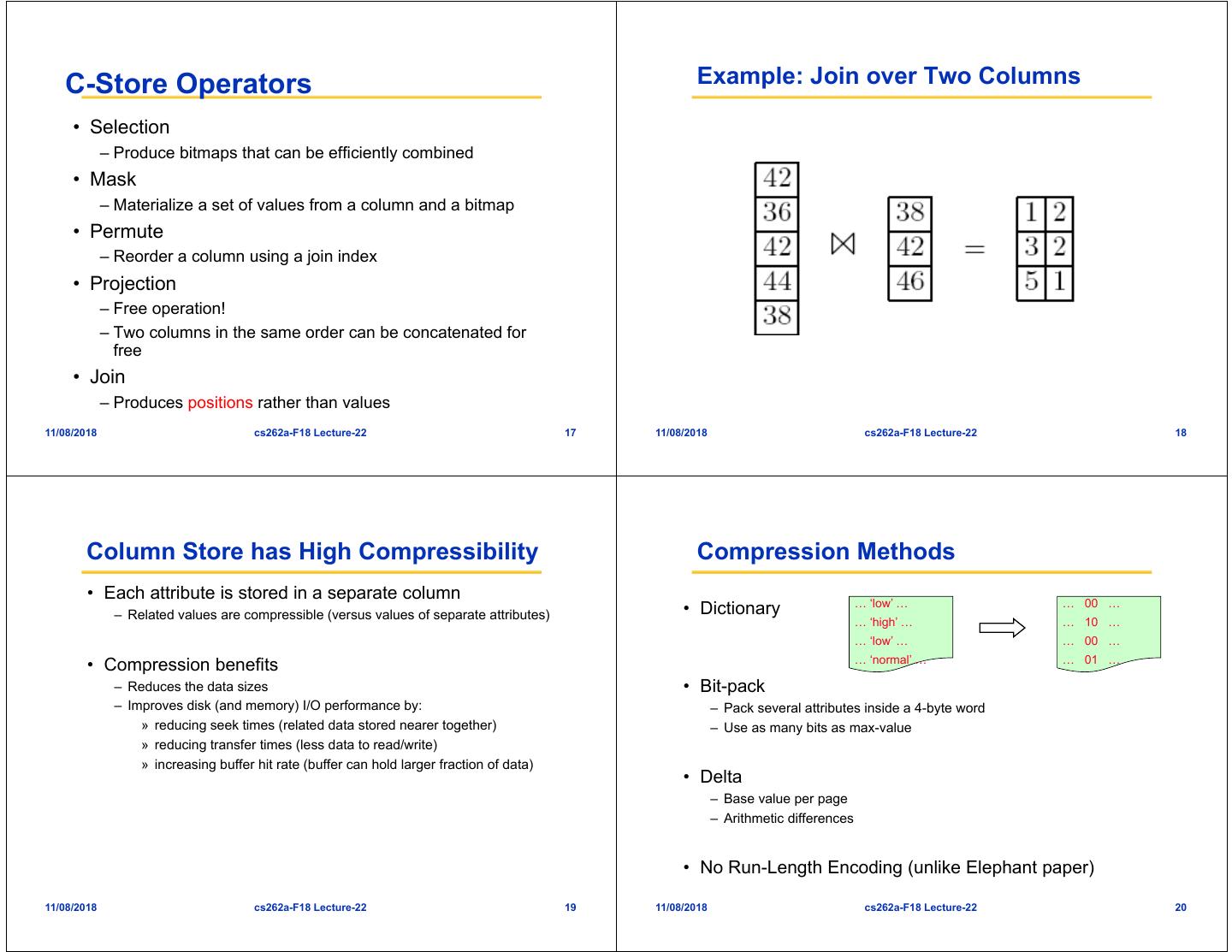 5 . C-Store Operators Example: Join over Two Columns • Selection – Produce bitmaps that can be efficiently combined • Mask – Materialize a set of values from a column and a bitmap • Permute – Reorder a column using a join index • Projection – Free operation! – Two columns in the same order can be concatenated for free • Join – Produces positions rather than values 11/08/2018 cs262a-F18 Lecture-22 17 11/08/2018 cs262a-F18 Lecture-22 18 Column Store has High Compressibility Compression Methods • Each attribute is stored in a separate column … ‘low’ … … 00 … – Related values are compressible (versus values of separate attributes) • Dictionary … ‘high’ … … 10 … … ‘low’ … … 00 … … ‘normal’ … … 01 … • Compression benefits – Reduces the data sizes • Bit-pack – Improves disk (and memory) I/O performance by: – Pack several attributes inside a 4-byte word » reducing seek times (related data stored nearer together) – Use as many bits as max-value » reducing transfer times (less data to read/write) » increasing buffer hit rate (buffer can hold larger fraction of data) • Delta – Base value per page – Arithmetic differences • No Run-Length Encoding (unlike Elephant paper) 11/08/2018 cs262a-F18 Lecture-22 19 11/08/2018 cs262a-F18 Lecture-22 20