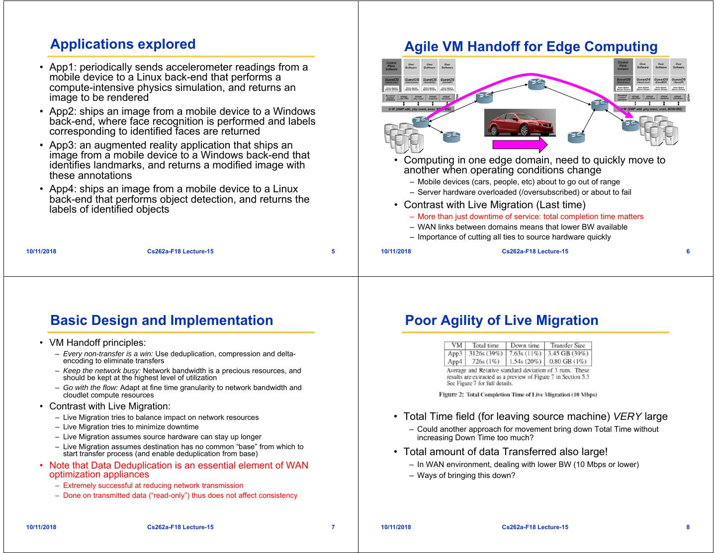 2 . Applications explored Agile VM Handoff for Edge Computing • App1: periodically sends accelerometer readings from a mobile device to a Linux back-end that performs a compute-intensive physics simulation, and returns an image to be rendered • App2: ships an image from a mobile device to a Windows back-end, where face recognition is performed and labels corresponding to identified faces are returned • App3: an augmented reality application that ships an image from a mobile device to a Windows back-end that • Computing in one edge domain, need to quickly move to identifies landmarks, and returns a modified image with another when operating conditions change these annotations – Mobile devices (cars, people, etc) about to go out of range • App4: ships an image from a mobile device to a Linux – Server hardware overloaded (/oversubscribed) or about to fail back-end that performs object detection, and returns the labels of identified objects • Contrast with Live Migration (Last time) – More than just downtime of service: total completion time matters – WAN links between domains means that lower BW available – Importance of cutting all ties to source hardware quickly 10/11/2018 Cs262a-F18 Lecture-15 5 10/11/2018 Cs262a-F18 Lecture-15 6 Basic Design and Implementation Poor Agility of Live Migration • VM Handoff principles: – Every non-transfer is a win: Use deduplication, compression and delta- encoding to eliminate transfers – Keep the network busy: Network bandwidth is a precious resources, and should be kept at the highest level of utilization – Go with the flow: Adapt at fine time granularity to network bandwidth and cloudlet compute resources • Contrast with Live Migration: – Live Migration tries to balance impact on network resources • Total Time field (for leaving source machine) VERY large – Live Migration tries to minimize downtime – Could another approach for movement bring down Total Time without – Live Migration assumes source hardware can stay up longer increasing Down Time too much? – Live Migration assumes destination has no common “base” from which to start transfer process (and enable deduplication from base) • Total amount of data Transferred also large! • Note that Data Deduplication is an essential element of WAN – In WAN environment, dealing with lower BW (10 Mbps or lower) optimization appliances – Ways of bringing this down? – Extremely successful at reducing network transmission – Done on transmitted data (“read-only”) thus does not affect consistency 10/11/2018 Cs262a-F18 Lecture-15 7 10/11/2018 Cs262a-F18 Lecture-15 8