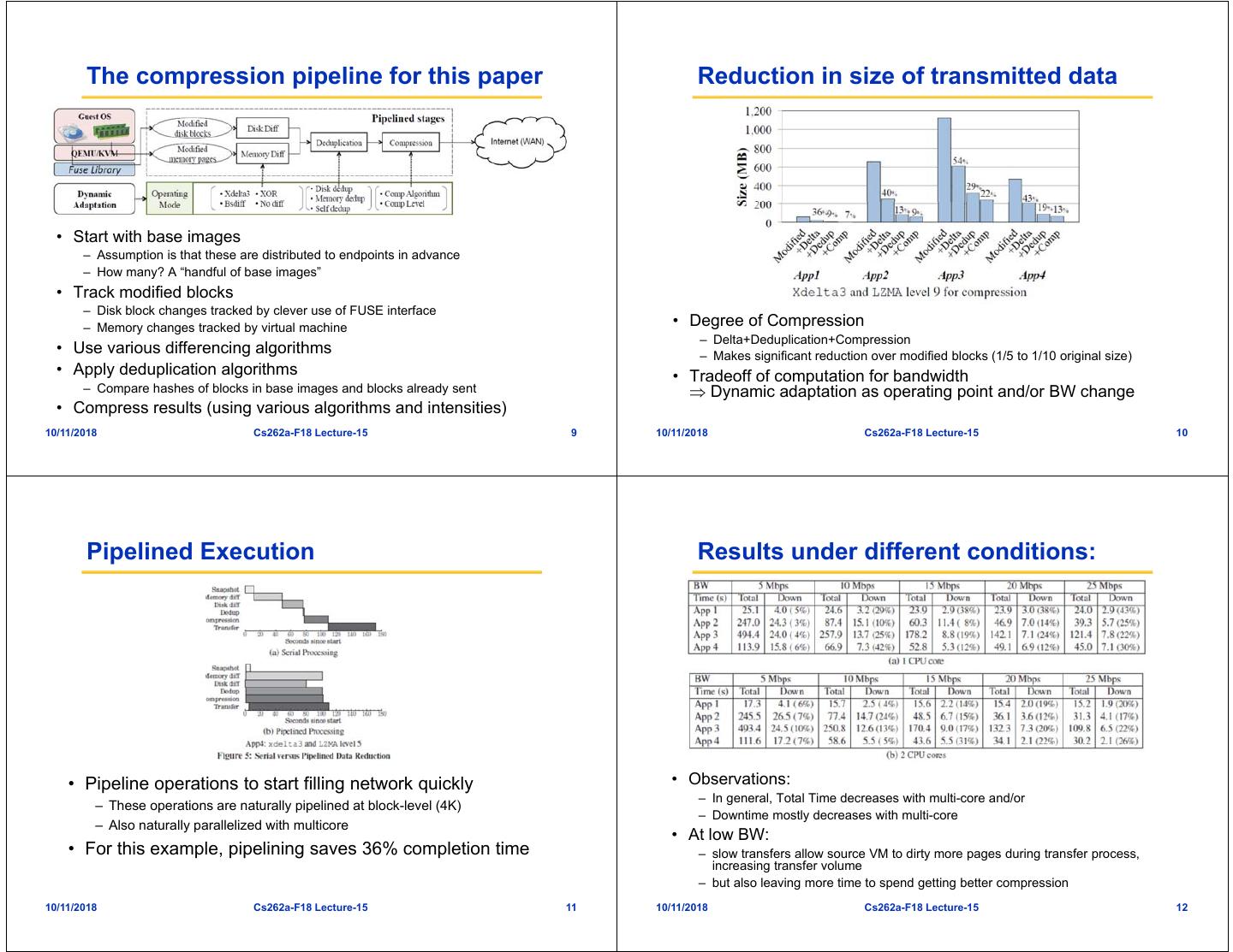 3 . The compression pipeline for this paper Reduction in size of transmitted data • Start with base images – Assumption is that these are distributed to endpoints in advance – How many? A “handful of base images” • Track modified blocks – Disk block changes tracked by clever use of FUSE interface – Memory changes tracked by virtual machine • Degree of Compression – Delta+Deduplication+Compression • Use various differencing algorithms – Makes significant reduction over modified blocks (1/5 to 1/10 original size) • Apply deduplication algorithms • Tradeoff of computation for bandwidth – Compare hashes of blocks in base images and blocks already sent Dynamic adaptation as operating point and/or BW change • Compress results (using various algorithms and intensities) 10/11/2018 Cs262a-F18 Lecture-15 9 10/11/2018 Cs262a-F18 Lecture-15 10 Pipelined Execution Results under different conditions: • Pipeline operations to start filling network quickly • Observations: – In general, Total Time decreases with multi-core and/or – These operations are naturally pipelined at block-level (4K) – Downtime mostly decreases with multi-core – Also naturally parallelized with multicore • At low BW: • For this example, pipelining saves 36% completion time – slow transfers allow source VM to dirty more pages during transfer process, increasing transfer volume – but also leaving more time to spend getting better compression 10/11/2018 Cs262a-F18 Lecture-15 11 10/11/2018 Cs262a-F18 Lecture-15 12