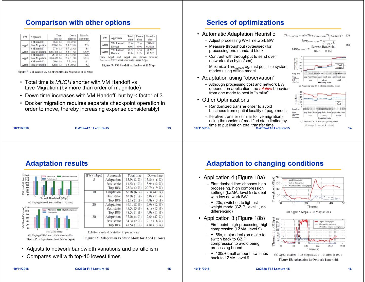 4 . Comparison with other options Series of optimizations • Automatic Adaptation Heuristic – Adjust processing WRT network BW – Measure throughput (bytes/sec) for processing one standard block – Contrast with throughput to send over network (also bytes/sec) – Maximize Thrusystem against possible system modes using offline model • Adaptation using “observation” • Total time is MUCH shorter with VM Handoff vs – Although processing cost and network BW Live Migration (by more than order of magnitude) depends on application, the relative behavior from one mode to next is “similar” • Down time increases with VM Handoff, but by < factor of 3 • Other Optimizations • Docker migration requires separate checkpoint operation in – Randomized transfer order to avoid order to move, thereby increasing expense considerably! bustiness from spatial locality of page mods – Iterative transfer (similar to live migration) using thresholds of modified state limited by time to put limit on total transfer time 10/11/2018 Cs262a-F18 Lecture-15 13 10/11/2018 Cs262a-F18 Lecture-15 14 Adaptation results Adaptation to changing conditions • Application 4 (Figure 18a) – First dashed line: chooses high processing, high compression settings (LZMA, level 9) to deal with low network BW – At 20s, switches to lightest weight mode (GZIP, level 1, no differencing) • Application 3 (Figure 18b) – First point, high processing, high compression (LZMA, level 9) – At 58s, major decision make to switch back to GZIP compression to avoid being • Adjusts to network bandwidth variations and parallelism processing bound – At 100s+small amount, switches • Compares well with top-10 lowest times back to LZMA, level 9 10/11/2018 Cs262a-F18 Lecture-15 15 10/11/2018 Cs262a-F18 Lecture-15 16