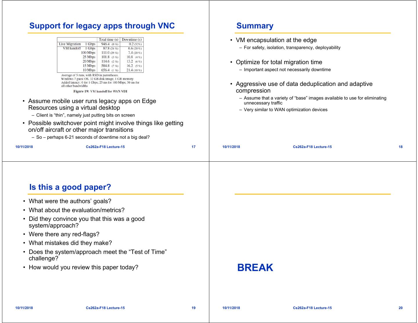 5 . Support for legacy apps through VNC Summary • VM encapsulation at the edge – For safety, isolation, transparency, deployability • Optimize for total migration time – Important aspect not necessarily downtime • Aggressive use of data deduplication and adaptive compression – Assume that a variety of “base” images available to use for eliminating • Assume mobile user runs legacy apps on Edge unnecessary traffic Resources using a virtual desktop – Very similar to WAN optimization devices – Client is “thin”, namely just putting bits on screen • Possible switchover point might involve things like getting on/off aircraft or other major transitions – So – perhaps 6-21 seconds of downtime not a big deal? 10/11/2018 Cs262a-F18 Lecture-15 17 10/11/2018 Cs262a-F18 Lecture-15 18 Is this a good paper? • What were the authors’ goals? • What about the evaluation/metrics? • Did they convince you that this was a good system/approach? • Were there any red-flags? • What mistakes did they make? • Does the system/approach meet the “Test of Time” challenge? • How would you review this paper today? BREAK 10/11/2018 Cs262a-F18 Lecture-15 19 10/11/2018 Cs262a-F18 Lecture-15 20