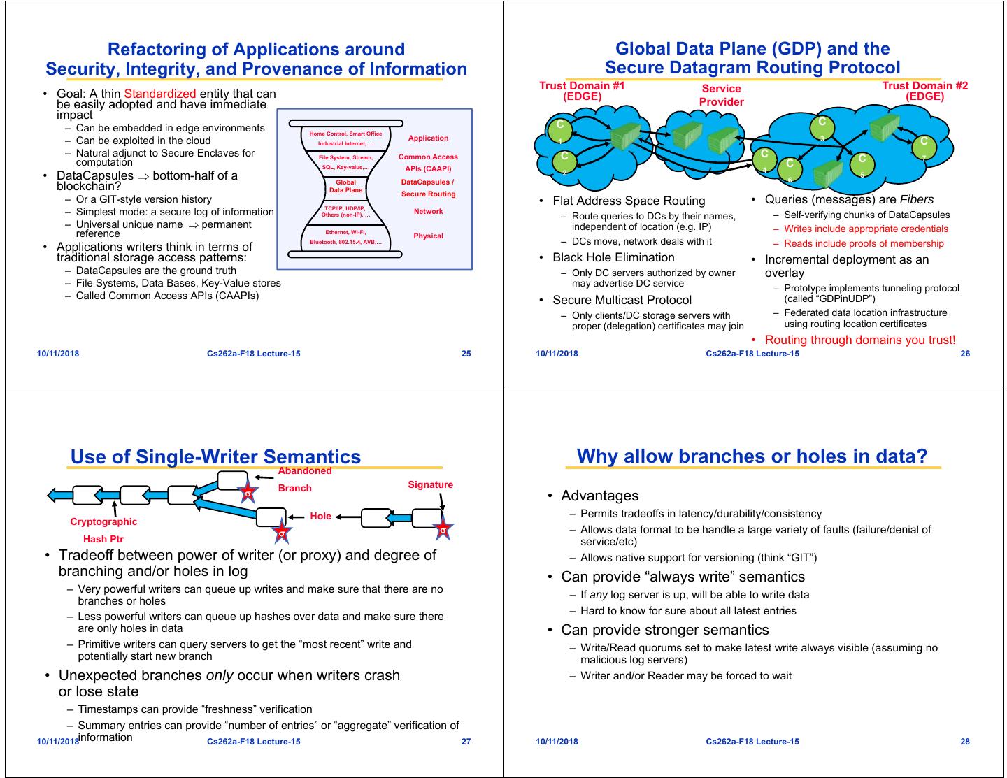 7 . Refactoring of Applications around Global Data Plane (GDP) and the Security, Integrity, and Provenance of Information Secure Datagram Routing Protocol Trust Domain #1 Service Trust Domain #2 • Goal: A thin Standardized entity that can (EDGE) (EDGE) be easily adopted and have immediate Provider impact C C – Can be embedded in edge environments Home Control, Smart Office – Can be exploited in the cloud Application 3 Industrial Internet, … 1 C – Natural adjunct to Secure Enclaves for File System, Stream, Common Access C C C 7 computation SQL, Key-value,… C APIs (CAAPI) 4 • DataCapsules bottom-half of a Global DataCapsules / 2 6 5 blockchain? Data Plane Secure Routing – Or a GIT-style version history • Flat Address Space Routing • Queries (messages) are Fibers TCP/IP, UDP/IP, – Simplest mode: a secure log of information Others (non-IP), … Network – Route queries to DCs by their names, – Self-verifying chunks of DataCapsules – Universal unique name permanent independent of location (e.g. IP) – Writes include appropriate credentials reference Ethernet, WI-FI, Physical Bluetooth, 802.15.4, AVB,… – DCs move, network deals with it – Reads include proofs of membership • Applications writers think in terms of traditional storage access patterns: • Black Hole Elimination • Incremental deployment as an – DataCapsules are the ground truth – Only DC servers authorized by owner overlay – File Systems, Data Bases, Key-Value stores may advertise DC service – Prototype implements tunneling protocol – Called Common Access APIs (CAAPIs) • Secure Multicast Protocol (called “GDPinUDP”) – Only clients/DC storage servers with – Federated data location infrastructure proper (delegation) certificates may join using routing location certificates • Routing through domains you trust! 10/11/2018 Cs262a-F18 Lecture-15 25 10/11/2018 Cs262a-F18 Lecture-15 26 Use of Single-Writer Semantics Why allow branches or holes in data? Abandoned Branch Signature • Advantages Hole – Permits tradeoffs in latency/durability/consistency Cryptographic – Allows data format to be handle a large variety of faults (failure/denial of Hash Ptr service/etc) • Tradeoff between power of writer (or proxy) and degree of – Allows native support for versioning (think “GIT”) branching and/or holes in log • Can provide “always write” semantics – Very powerful writers can queue up writes and make sure that there are no – If any log server is up, will be able to write data branches or holes – Hard to know for sure about all latest entries – Less powerful writers can queue up hashes over data and make sure there are only holes in data • Can provide stronger semantics – Primitive writers can query servers to get the “most recent” write and – Write/Read quorums set to make latest write always visible (assuming no potentially start new branch malicious log servers) • Unexpected branches only occur when writers crash – Writer and/or Reader may be forced to wait or lose state – Timestamps can provide “freshness” verification – Summary entries can provide “number of entries” or “aggregate” verification of 10/11/2018information Cs262a-F18 Lecture-15 27 10/11/2018 Cs262a-F18 Lecture-15 28