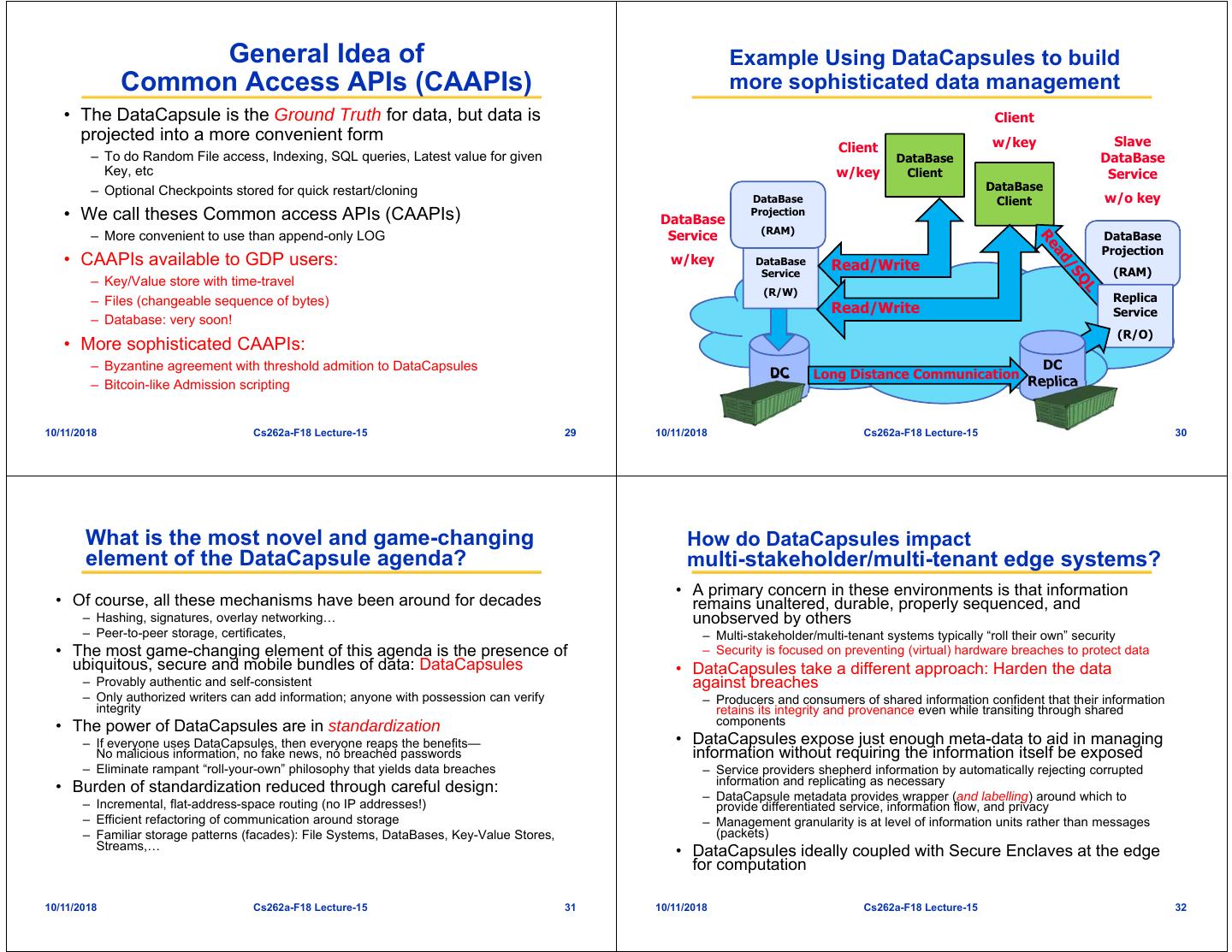 8 . General Idea of Example Using DataCapsules to build Common Access APIs (CAAPIs) more sophisticated data management • The DataCapsule is the Ground Truth for data, but data is Client projected into a more convenient form w/key Slave Client – To do Random File access, Indexing, SQL queries, Latest value for given DataBase DataBase Key, etc w/key Client Service – Optional Checkpoints stored for quick restart/cloning DataBase DataBase Client w/o key • We call theses Common access APIs (CAAPIs) DataBase Projection (RAM) – More convenient to use than append-only LOG Service DataBase Projection • CAAPIs available to GDP users: w/key DataBase Read/Write Service (RAM) – Key/Value store with time-travel (R/W) – Files (changeable sequence of bytes) Replica Read/Write Service – Database: very soon! (R/O) • More sophisticated CAAPIs: – Byzantine agreement with threshold admition to DataCapsules DC DC Long Distance Communication Replica – Bitcoin-like Admission scripting 10/11/2018 Cs262a-F18 Lecture-15 29 10/11/2018 Cs262a-F18 Lecture-15 30 What is the most novel and game-changing How do DataCapsules impact element of the DataCapsule agenda? multi-stakeholder/multi-tenant edge systems? • A primary concern in these environments is that information • Of course, all these mechanisms have been around for decades remains unaltered, durable, properly sequenced, and – Hashing, signatures, overlay networking… unobserved by others – Peer-to-peer storage, certificates, – Multi-stakeholder/multi-tenant systems typically “roll their own” security • The most game-changing element of this agenda is the presence of – Security is focused on preventing (virtual) hardware breaches to protect data ubiquitous, secure and mobile bundles of data: DataCapsules • DataCapsules take a different approach: Harden the data – Provably authentic and self-consistent against breaches – Only authorized writers can add information; anyone with possession can verify – Producers and consumers of shared information confident that their information integrity retains its integrity and provenance even while transiting through shared • The power of DataCapsules are in standardization components – If everyone uses DataCapsules, then everyone reaps the benefits— • DataCapsules expose just enough meta-data to aid in managing No malicious information, no fake news, no breached passwords information without requiring the information itself be exposed – Eliminate rampant “roll-your-own” philosophy that yields data breaches – Service providers shepherd information by automatically rejecting corrupted information and replicating as necessary • Burden of standardization reduced through careful design: – DataCapsule metadata provides wrapper (and labelling) around which to – Incremental, flat-address-space routing (no IP addresses!) provide differentiated service, information flow, and privacy – Efficient refactoring of communication around storage – Management granularity is at level of information units rather than messages – Familiar storage patterns (facades): File Systems, DataBases, Key-Value Stores, (packets) Streams,… • DataCapsules ideally coupled with Secure Enclaves at the edge for computation 10/11/2018 Cs262a-F18 Lecture-15 31 10/11/2018 Cs262a-F18 Lecture-15 32