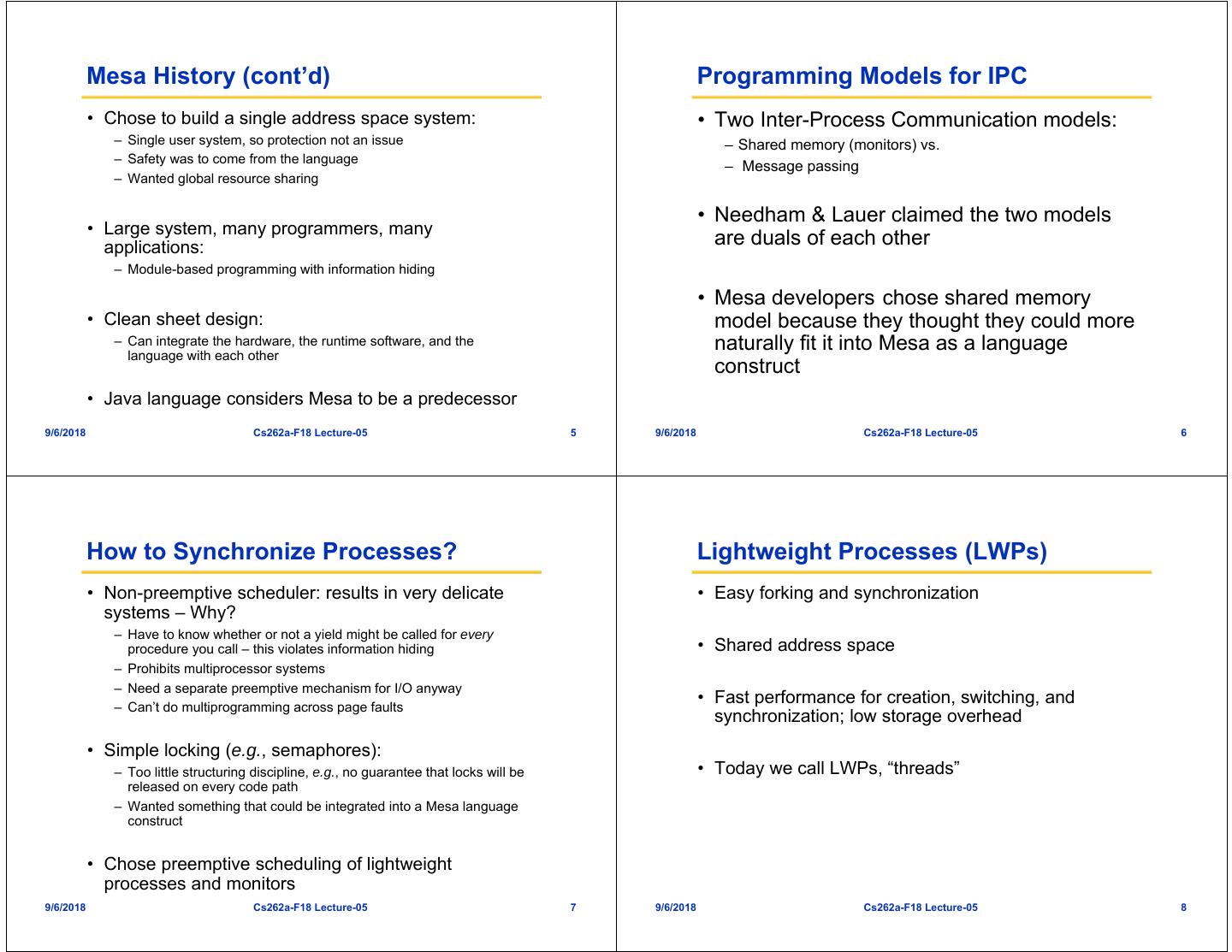 2 . Mesa History (cont’d) Programming Models for IPC • Chose to build a single address space system: • Two Inter-Process Communication models: – Single user system, so protection not an issue – Shared memory (monitors) vs. – Safety was to come from the language – Message passing – Wanted global resource sharing • Needham & Lauer claimed the two models • Large system, many programmers, many applications: are duals of each other – Module-based programming with information hiding • Mesa developers chose shared memory • Clean sheet design: model because they thought they could more – Can integrate the hardware, the runtime software, and the language with each other naturally fit it into Mesa as a language construct • Java language considers Mesa to be a predecessor 9/6/2018 Cs262a-F18 Lecture-05 5 9/6/2018 Cs262a-F18 Lecture-05 6 How to Synchronize Processes? Lightweight Processes (LWPs) • Non-preemptive scheduler: results in very delicate • Easy forking and synchronization systems – Why? – Have to know whether or not a yield might be called for every procedure you call – this violates information hiding • Shared address space – Prohibits multiprocessor systems – Need a separate preemptive mechanism for I/O anyway • Fast performance for creation, switching, and – Can’t do multiprogramming across page faults synchronization; low storage overhead • Simple locking (e.g., semaphores): – Too little structuring discipline, e.g., no guarantee that locks will be • Today we call LWPs, “threads” released on every code path – Wanted something that could be integrated into a Mesa language construct • Chose preemptive scheduling of lightweight processes and monitors 9/6/2018 Cs262a-F18 Lecture-05 7 9/6/2018 Cs262a-F18 Lecture-05 8