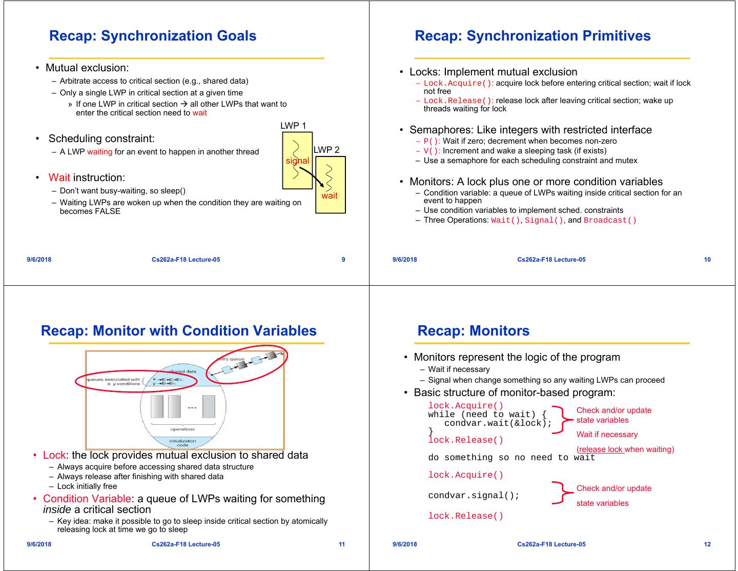 3 . Recap: Synchronization Goals Recap: Synchronization Primitives • Mutual exclusion: • Locks: Implement mutual exclusion – Arbitrate access to critical section (e.g., shared data) – Lock.Acquire(): acquire lock before entering critical section; wait if lock – Only a single LWP in critical section at a given time not free » If one LWP in critical section all other LWPs that want to – Lock.Release(): release lock after leaving critical section; wake up threads waiting for lock enter the critical section need to wait LWP 1 • Semaphores: Like integers with restricted interface • Scheduling constraint: – P(): Wait if zero; decrement when becomes non-zero – A LWP waiting for an event to happen in another thread LWP 2 – V(): Increment and wake a sleeping task (if exists) signal – Use a semaphore for each scheduling constraint and mutex • Wait instruction: • Monitors: A lock plus one or more condition variables – Don’t want busy-waiting, so sleep() – Condition variable: a queue of LWPs waiting inside critical section for an wait – Waiting LWPs are woken up when the condition they are waiting on event to happen becomes FALSE – Use condition variables to implement sched. constraints – Three Operations: Wait(), Signal(), and Broadcast() 9/6/2018 Cs262a-F18 Lecture-05 9 9/6/2018 Cs262a-F18 Lecture-05 10 Recap: Monitor with Condition Variables Recap: Monitors • Monitors represent the logic of the program – Wait if necessary – Signal when change something so any waiting LWPs can proceed • Basic structure of monitor-based program: lock.Acquire() Check and/or update while (need to wait) { condvar.wait(&lock); state variables } Wait if necessary lock.Release() (release lock when waiting) • Lock: the lock provides mutual exclusion to shared data do something so no need to wait – Always acquire before accessing shared data structure – Always release after finishing with shared data lock.Acquire() – Lock initially free Check and/or update • Condition Variable: a queue of LWPs waiting for something condvar.signal(); state variables inside a critical section lock.Release() – Key idea: make it possible to go to sleep inside critical section by atomically releasing lock at time we go to sleep 9/6/2018 Cs262a-F18 Lecture-05 11 9/6/2018 Cs262a-F18 Lecture-05 12
