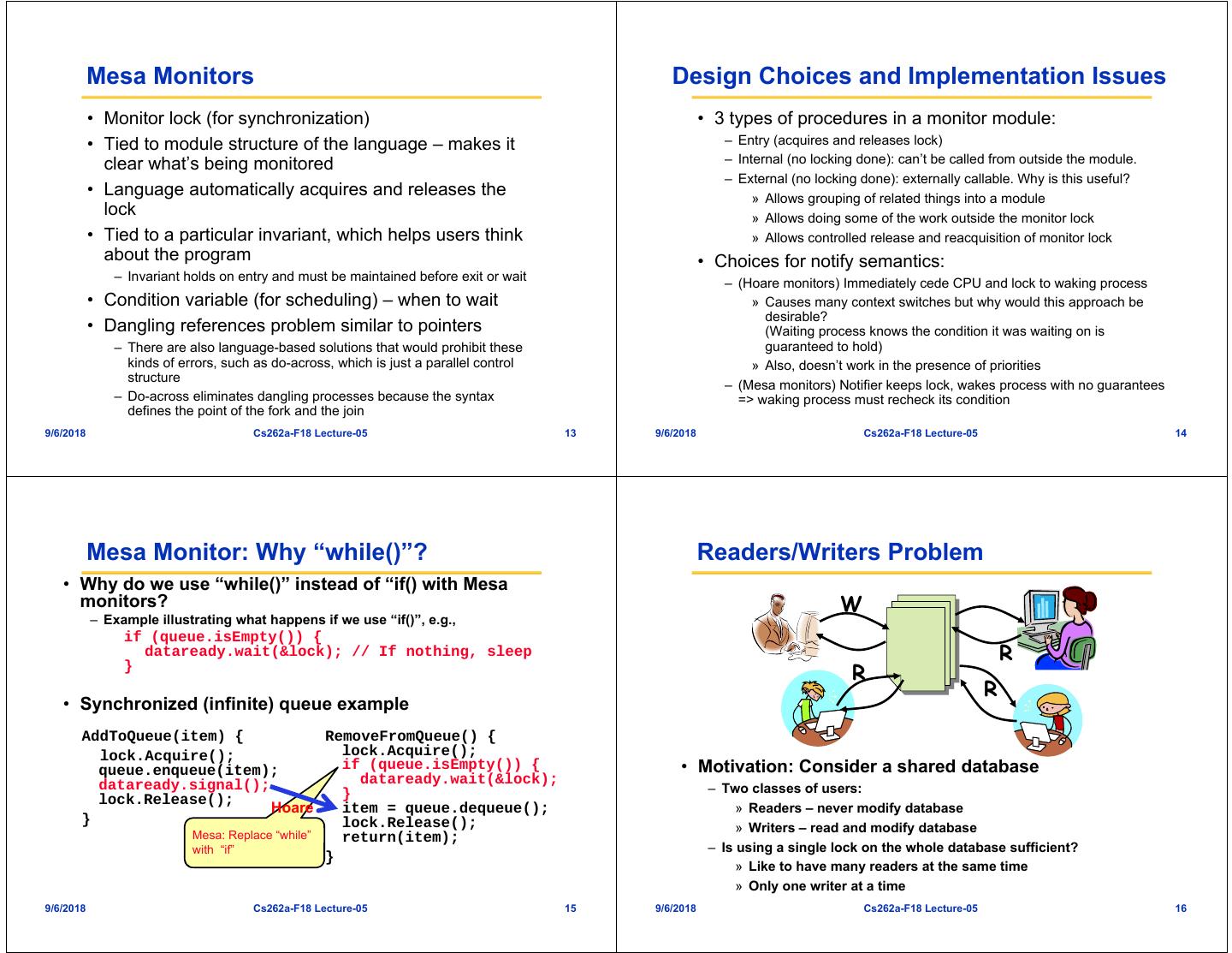 4 . Mesa Monitors Design Choices and Implementation Issues • Monitor lock (for synchronization) • 3 types of procedures in a monitor module: • Tied to module structure of the language – makes it – Entry (acquires and releases lock) clear what’s being monitored – Internal (no locking done): can’t be called from outside the module. – External (no locking done): externally callable. Why is this useful? • Language automatically acquires and releases the » Allows grouping of related things into a module lock » Allows doing some of the work outside the monitor lock • Tied to a particular invariant, which helps users think » Allows controlled release and reacquisition of monitor lock about the program • Choices for notify semantics: – Invariant holds on entry and must be maintained before exit or wait – (Hoare monitors) Immediately cede CPU and lock to waking process • Condition variable (for scheduling) – when to wait » Causes many context switches but why would this approach be desirable? • Dangling references problem similar to pointers (Waiting process knows the condition it was waiting on is – There are also language-based solutions that would prohibit these guaranteed to hold) kinds of errors, such as do-across, which is just a parallel control » Also, doesn’t work in the presence of priorities structure – (Mesa monitors) Notifier keeps lock, wakes process with no guarantees – Do-across eliminates dangling processes because the syntax => waking process must recheck its condition defines the point of the fork and the join 9/6/2018 Cs262a-F18 Lecture-05 13 9/6/2018 Cs262a-F18 Lecture-05 14 Mesa Monitor: Why “while()”? Readers/Writers Problem • Why do we use “while()” instead of “if() with Mesa monitors? W – Example illustrating what happens if we use “if()”, e.g., if (queue.isEmpty()) { dataready.wait(&lock); // If nothing, sleep R } R R • Synchronized (infinite) queue example AddToQueue(item) { RemoveFromQueue() { lock.Acquire(); lock.Acquire(); queue.enqueue(item); if (queue.isEmpty()) { • Motivation: Consider a shared database dataready.signal(); dataready.wait(&lock); } – Two classes of users: lock.Release(); Hoare item = queue.dequeue(); » Readers – never modify database } lock.Release(); » Writers – read and modify database Mesa: Replace “while” return(item); with “if” – Is using a single lock on the whole database sufficient? } » Like to have many readers at the same time » Only one writer at a time 9/6/2018 Cs262a-F18 Lecture-05 15 9/6/2018 Cs262a-F18 Lecture-05 16
