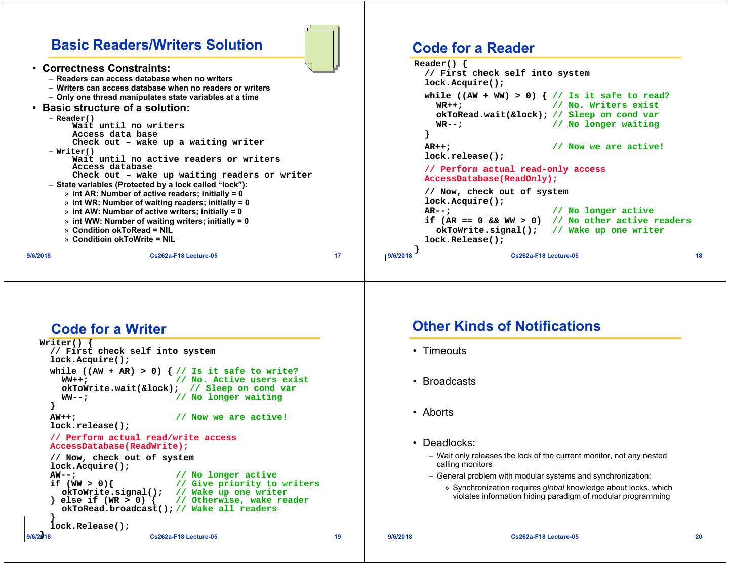 5 . Basic Readers/Writers Solution Code for a Reader Reader() { • Correctness Constraints: // First check self into system – Readers can access database when no writers lock.Acquire(); – Writers can access database when no readers or writers – Only one thread manipulates state variables at a time while ((AW + WW) > 0) { // Is it safe to read? • Basic structure of a solution: WR++; // No. Writers exist – Reader() okToRead.wait(&lock); // Sleep on cond var Wait until no writers WR--; // No longer waiting Access data base } Check out – wake up a waiting writer AR++; // Now we are active! – Writer() Wait until no active readers or writers lock.release(); Access database // Perform actual read-only access Check out – wake up waiting readers or writer AccessDatabase(ReadOnly); – State variables (Protected by a lock called “lock”): » int AR: Number of active readers; initially = 0 // Now, check out of system » int WR: Number of waiting readers; initially = 0 lock.Acquire(); » int AW: Number of active writers; initially = 0 AR--; // No longer active » int WW: Number of waiting writers; initially = 0 if (AR == 0 && WW > 0) // No other active readers » Condition okToRead = NIL okToWrite.signal(); // Wake up one writer » Conditioin okToWrite = NIL lock.Release(); } 9/6/2018 Cs262a-F18 Lecture-05 17 9/6/2018 Cs262a-F18 Lecture-05 18 Code for a Writer Other Kinds of Notifications Writer() { // First check self into system • Timeouts lock.Acquire(); while ((AW + AR) > 0) { // Is it safe to write? WW++; // No. Active users exist • Broadcasts okToWrite.wait(&lock); // Sleep on cond var WW--; // No longer waiting } AW++; // Now we are active! • Aborts lock.release(); // Perform actual read/write access AccessDatabase(ReadWrite); • Deadlocks: // Now, check out of system – Wait only releases the lock of the current monitor, not any nested lock.Acquire(); calling monitors AW--; // No longer active – General problem with modular systems and synchronization: if (WW > 0){ // Give priority to writers » Synchronization requires global knowledge about locks, which okToWrite.signal(); // Wake up one writer violates information hiding paradigm of modular programming } else if (WR > 0) { // Otherwise, wake reader okToRead.broadcast(); // Wake all readers } lock.Release(); } 9/6/2018 Cs262a-F18 Lecture-05 19 9/6/2018 Cs262a-F18 Lecture-05 20