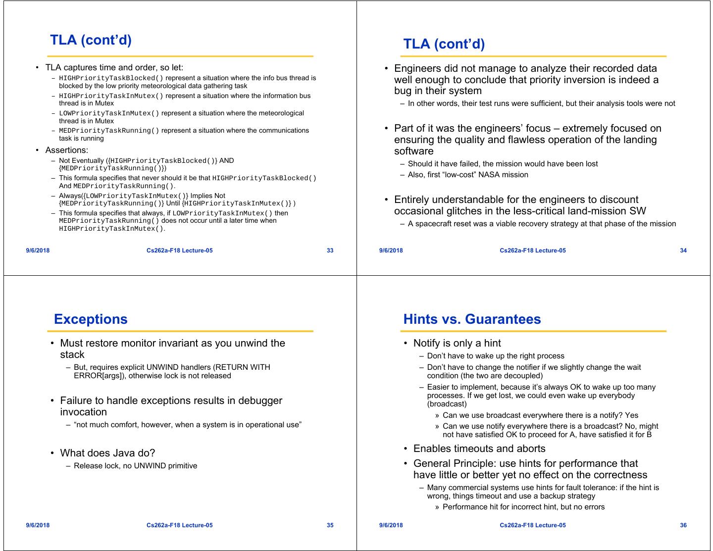 9 . TLA (cont’d) TLA (cont’d) • TLA captures time and order, so let: • Engineers did not manage to analyze their recorded data – HIGHPriorityTaskBlocked() represent a situation where the info bus thread is blocked by the low priority meteorological data gathering task well enough to conclude that priority inversion is indeed a – HIGHPriorityTaskInMutex() represent a situation where the information bus bug in their system thread is in Mutex – In other words, their test runs were sufficient, but their analysis tools were not – LOWPriorityTaskInMutex() represent a situation where the meteorological thread is in Mutex – MEDPriorityTaskRunning() represent a situation where the communications • Part of it was the engineers’ focus – extremely focused on task is running ensuring the quality and flawless operation of the landing • Assertions: software – Not Eventually ({HIGHPriorityTaskBlocked()} AND – Should it have failed, the mission would have been lost {MEDPriorityTaskRunning()}) – This formula specifies that never should it be that HIGHPriorityTaskBlocked() – Also, first “low-cost” NASA mission And MEDPriorityTaskRunning(). – Always({LOWPriorityTaskInMutex()} Implies Not {MEDPriorityTaskRunning()} Until {HIGHPriorityTaskInMutex()} ) • Entirely understandable for the engineers to discount – This formula specifies that always, if LOWPriorityTaskInMutex() then occasional glitches in the less-critical land-mission SW MEDPriorityTaskRunning() does not occur until a later time when – A spacecraft reset was a viable recovery strategy at that phase of the mission HIGHPriorityTaskInMutex(). 9/6/2018 Cs262a-F18 Lecture-05 33 9/6/2018 Cs262a-F18 Lecture-05 34 Exceptions Hints vs. Guarantees • Must restore monitor invariant as you unwind the • Notify is only a hint stack – Don’t have to wake up the right process – But, requires explicit UNWIND handlers (RETURN WITH – Don’t have to change the notifier if we slightly change the wait ERROR[args]), otherwise lock is not released condition (the two are decoupled) – Easier to implement, because it’s always OK to wake up too many processes. If we get lost, we could even wake up everybody • Failure to handle exceptions results in debugger (broadcast) invocation » Can we use broadcast everywhere there is a notify? Yes – “not much comfort, however, when a system is in operational use” » Can we use notify everywhere there is a broadcast? No, might not have satisfied OK to proceed for A, have satisfied it for B • What does Java do? • Enables timeouts and aborts – Release lock, no UNWIND primitive • General Principle: use hints for performance that have little or better yet no effect on the correctness – Many commercial systems use hints for fault tolerance: if the hint is wrong, things timeout and use a backup strategy » Performance hit for incorrect hint, but no errors 9/6/2018 Cs262a-F18 Lecture-05 35 9/6/2018 Cs262a-F18 Lecture-05 36