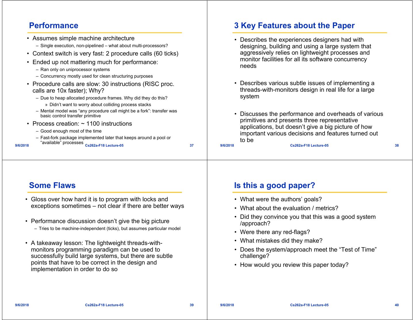 10 . Performance 3 Key Features about the Paper • Assumes simple machine architecture • Describes the experiences designers had with – Single execution, non-pipelined – what about multi-processors? designing, building and using a large system that • Context switch is very fast: 2 procedure calls (60 ticks) aggressively relies on lightweight processes and • Ended up not mattering much for performance: monitor facilities for all its software concurrency needs – Ran only on uniprocessor systems – Concurrency mostly used for clean structuring purposes • Procedure calls are slow: 30 instructions (RISC proc. • Describes various subtle issues of implementing a calls are 10x faster); Why? threads-with-monitors design in real life for a large – Due to heap allocated procedure frames. Why did they do this? system » Didn’t want to worry about colliding process stacks – Mental model was “any procedure call might be a fork”: transfer was basic control transfer primitive • Discusses the performance and overheads of various primitives and presents three representative • Process creation: ~ 1100 instructions applications, but doesn’t give a big picture of how – Good enough most of the time important various decisions and features turned out – Fast-fork package implemented later that keeps around a pool or “available” processes to be 9/6/2018 Cs262a-F18 Lecture-05 37 9/6/2018 Cs262a-F18 Lecture-05 38 Some Flaws Is this a good paper? • Gloss over how hard it is to program with locks and • What were the authors’ goals? exceptions sometimes – not clear if there are better ways • What about the evaluation / metrics? • Did they convince you that this was a good system • Performance discussion doesn’t give the big picture /approach? – Tries to be machine-independent (ticks), but assumes particular model • Were there any red-flags? • A takeaway lesson: The lightweight threads-with- • What mistakes did they make? monitors programming paradigm can be used to • Does the system/approach meet the “Test of Time” successfully build large systems, but there are subtle challenge? points that have to be correct in the design and • How would you review this paper today? implementation in order to do so 9/6/2018 Cs262a-F18 Lecture-05 39 9/6/2018 Cs262a-F18 Lecture-05 40