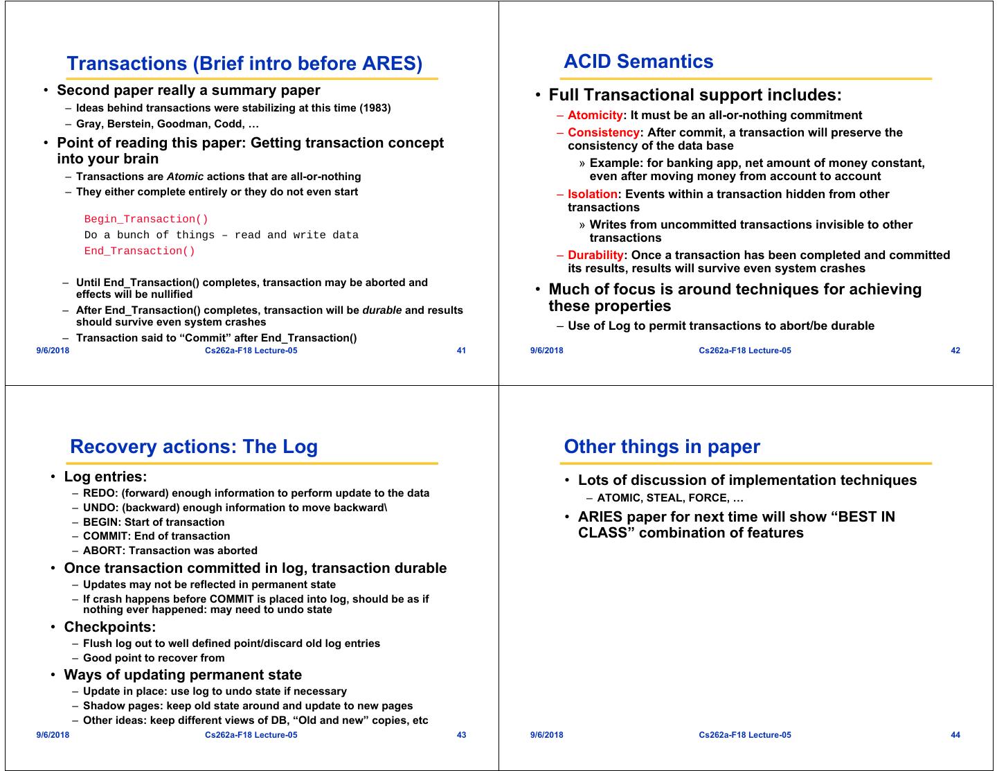 11 . Transactions (Brief intro before ARES) ACID Semantics • Second paper really a summary paper • Full Transactional support includes: – Ideas behind transactions were stabilizing at this time (1983) – Atomicity: It must be an all-or-nothing commitment – Gray, Berstein, Goodman, Codd, … – Consistency: After commit, a transaction will preserve the • Point of reading this paper: Getting transaction concept consistency of the data base into your brain » Example: for banking app, net amount of money constant, – Transactions are Atomic actions that are all-or-nothing even after moving money from account to account – They either complete entirely or they do not even start – Isolation: Events within a transaction hidden from other transactions Begin_Transaction() » Writes from uncommitted transactions invisible to other Do a bunch of things – read and write data transactions End_Transaction() – Durability: Once a transaction has been completed and committed its results, results will survive even system crashes – Until End_Transaction() completes, transaction may be aborted and effects will be nullified • Much of focus is around techniques for achieving – After End_Transaction() completes, transaction will be durable and results these properties should survive even system crashes – Use of Log to permit transactions to abort/be durable – Transaction said to “Commit” after End_Transaction() 9/6/2018 Cs262a-F18 Lecture-05 41 9/6/2018 Cs262a-F18 Lecture-05 42 Recovery actions: The Log Other things in paper • Log entries: • Lots of discussion of implementation techniques – REDO: (forward) enough information to perform update to the data – ATOMIC, STEAL, FORCE, … – UNDO: (backward) enough information to move backward\ – BEGIN: Start of transaction • ARIES paper for next time will show “BEST IN – COMMIT: End of transaction CLASS” combination of features – ABORT: Transaction was aborted • Once transaction committed in log, transaction durable – Updates may not be reflected in permanent state – If crash happens before COMMIT is placed into log, should be as if nothing ever happened: may need to undo state • Checkpoints: – Flush log out to well defined point/discard old log entries – Good point to recover from • Ways of updating permanent state – Update in place: use log to undo state if necessary – Shadow pages: keep old state around and update to new pages – Other ideas: keep different views of DB, “Old and new” copies, etc 9/6/2018 Cs262a-F18 Lecture-05 43 9/6/2018 Cs262a-F18 Lecture-05 44