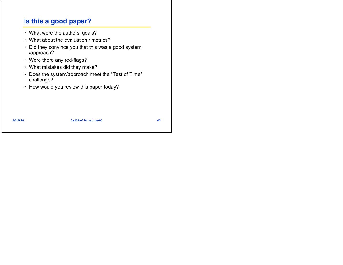 12 . Is this a good paper? • What were the authors’ goals? • What about the evaluation / metrics? • Did they convince you that this was a good system /approach? • Were there any red-flags? • What mistakes did they make? • Does the system/approach meet the “Test of Time” challenge? • How would you review this paper today? 9/6/2018 Cs262a-F18 Lecture-05 45