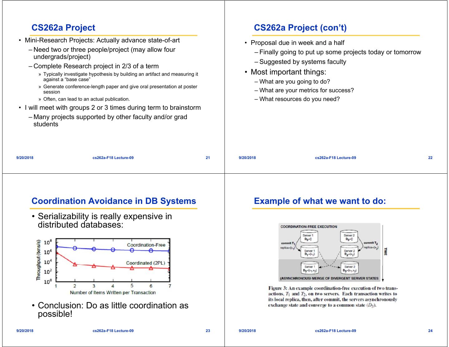 6 . CS262a Project CS262a Project (con’t) • Mini-Research Projects: Actually advance state-of-art • Proposal due in week and a half – Need two or three people/project (may allow four – Finally going to put up some projects today or tomorrow undergrads/project) – Suggested by systems faculty – Complete Research project in 2/3 of a term » Typically investigate hypothesis by building an artifact and measuring it • Most important things: against a “base case” – What are you going to do? » Generate conference-length paper and give oral presentation at poster session – What are your metrics for success? » Often, can lead to an actual publication. – What resources do you need? • I will meet with groups 2 or 3 times during term to brainstorm – Many projects supported by other faculty and/or grad students 9/20/2018 cs262a-F18 Lecture-09 21 9/20/2018 cs262a-F18 Lecture-09 22 Coordination Avoidance in DB Systems Example of what we want to do: • Serializability is really expensive in distributed databases: • Conclusion: Do as little coordination as possible! 9/20/2018 cs262a-F18 Lecture-09 23 9/20/2018 cs262a-F18 Lecture-09 24
