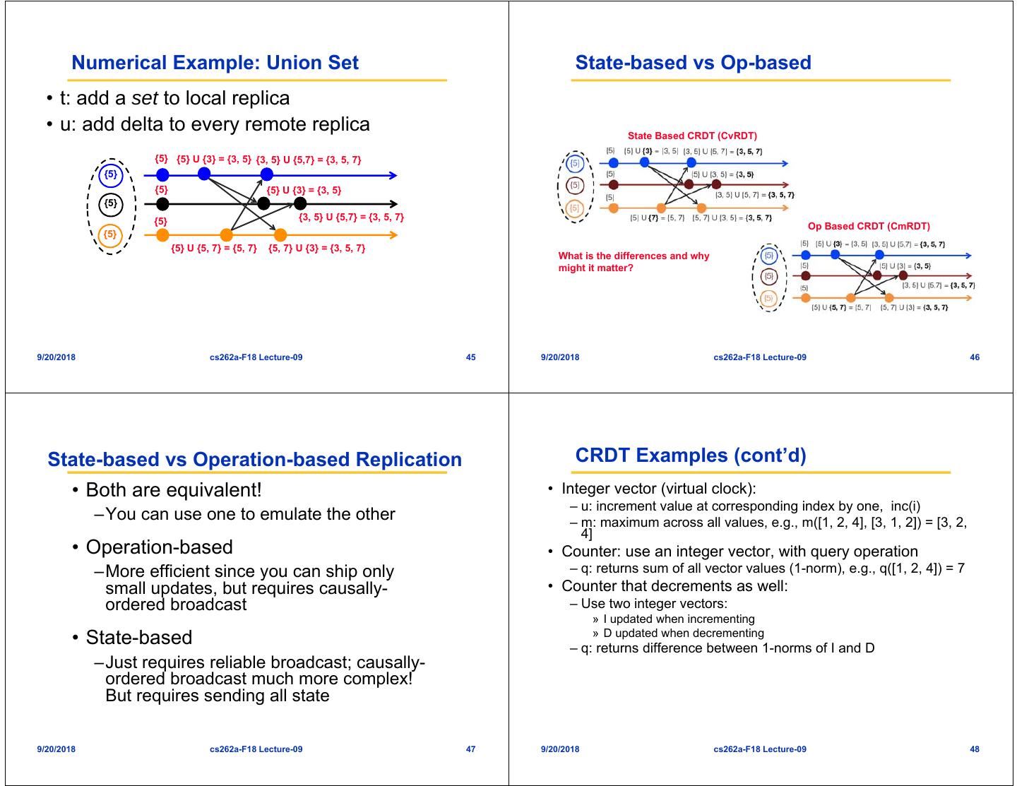 12 . Numerical Example: Union Set State-based vs Op-based • t: add a set to local replica • u: add delta to every remote replica State Based CRDT (CvRDT) {5} {5} U {3} = {3, 5} {3, 5} U {5,7} = {3, 5, 7} {5} {5} {5} U {3} = {3, 5} {5} {5} {3, 5} U {5,7} = {3, 5, 7} Op Based CRDT (CmRDT) {5} {5} U {5, 7} = {5, 7} {5, 7} U {3} = {3, 5, 7} What is the differences and why might it matter? 9/20/2018 cs262a-F18 Lecture-09 45 9/20/2018 cs262a-F18 Lecture-09 46 State-based vs Operation-based Replication CRDT Examples (cont’d) • Both are equivalent! • Integer vector (virtual clock): – u: increment value at corresponding index by one, inc(i) –You can use one to emulate the other – m: maximum across all values, e.g., m([1, 2, 4], [3, 1, 2]) = [3, 2, 4] • Operation-based • Counter: use an integer vector, with query operation –More efficient since you can ship only – q: returns sum of all vector values (1-norm), e.g., q([1, 2, 4]) = 7 small updates, but requires causally- • Counter that decrements as well: ordered broadcast – Use two integer vectors: » I updated when incrementing » D updated when decrementing • State-based – q: returns difference between 1-norms of I and D –Just requires reliable broadcast; causally- ordered broadcast much more complex! But requires sending all state 9/20/2018 cs262a-F18 Lecture-09 47 9/20/2018 cs262a-F18 Lecture-09 48