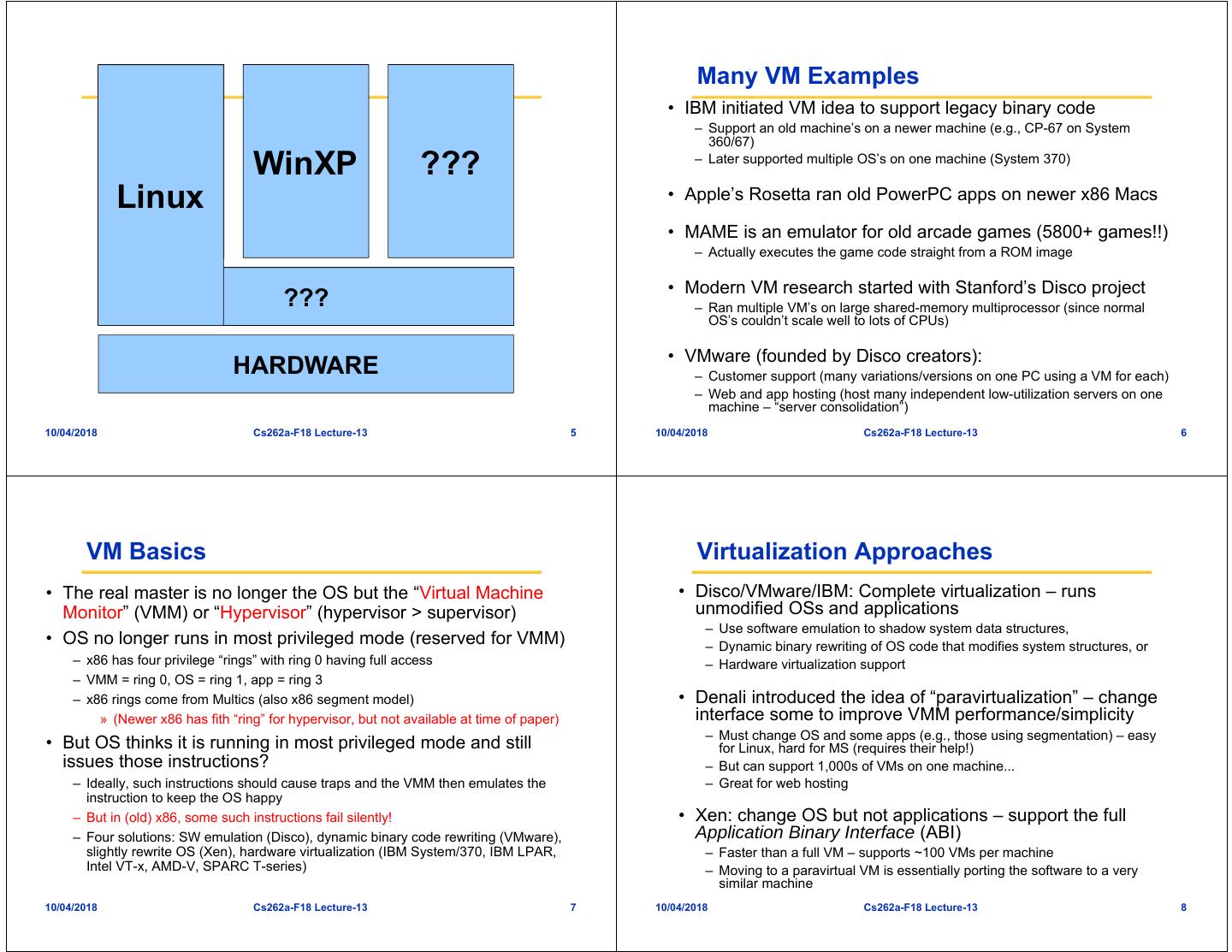 2 . Many VM Examples • IBM initiated VM idea to support legacy binary code – Support an old machine’s on a newer machine (e.g., CP-67 on System 360/67) Linux WinXP ??? – Later supported multiple OS’s on one machine (System 370) Linux • Apple’s Rosetta ran old PowerPC apps on newer x86 Macs • MAME is an emulator for old arcade games (5800+ games!!) – Actually executes the game code straight from a ROM image • Modern VM research started with Stanford’s Disco project Virtual Machine ??? Monitor – Ran multiple VM’s on large shared-memory multiprocessor (since normal OS’s couldn’t scale well to lots of CPUs) • VMware (founded by Disco creators): HARDWARE – Customer support (many variations/versions on one PC using a VM for each) – Web and app hosting (host many independent low-utilization servers on one machine – “server consolidation”) 10/04/2018 Cs262a-F18 Lecture-13 5 10/04/2018 Cs262a-F18 Lecture-13 6 VM Basics Virtualization Approaches • The real master is no longer the OS but the “Virtual Machine • Disco/VMware/IBM: Complete virtualization – runs Monitor” (VMM) or “Hypervisor” (hypervisor > supervisor) unmodified OSs and applications – Use software emulation to shadow system data structures, • OS no longer runs in most privileged mode (reserved for VMM) – Dynamic binary rewriting of OS code that modifies system structures, or – x86 has four privilege “rings” with ring 0 having full access – Hardware virtualization support – VMM = ring 0, OS = ring 1, app = ring 3 – x86 rings come from Multics (also x86 segment model) • Denali introduced the idea of “paravirtualization” – change » (Newer x86 has fith “ring” for hypervisor, but not available at time of paper) interface some to improve VMM performance/simplicity – Must change OS and some apps (e.g., those using segmentation) – easy • But OS thinks it is running in most privileged mode and still for Linux, hard for MS (requires their help!) issues those instructions? – But can support 1,000s of VMs on one machine... – Ideally, such instructions should cause traps and the VMM then emulates the – Great for web hosting instruction to keep the OS happy – But in (old) x86, some such instructions fail silently! • Xen: change OS but not applications – support the full – Four solutions: SW emulation (Disco), dynamic binary code rewriting (VMware), Application Binary Interface (ABI) slightly rewrite OS (Xen), hardware virtualization (IBM System/370, IBM LPAR, – Faster than a full VM – supports ~100 VMs per machine Intel VT-x, AMD-V, SPARC T-series) – Moving to a paravirtual VM is essentially porting the software to a very similar machine 10/04/2018 Cs262a-F18 Lecture-13 7 10/04/2018 Cs262a-F18 Lecture-13 8