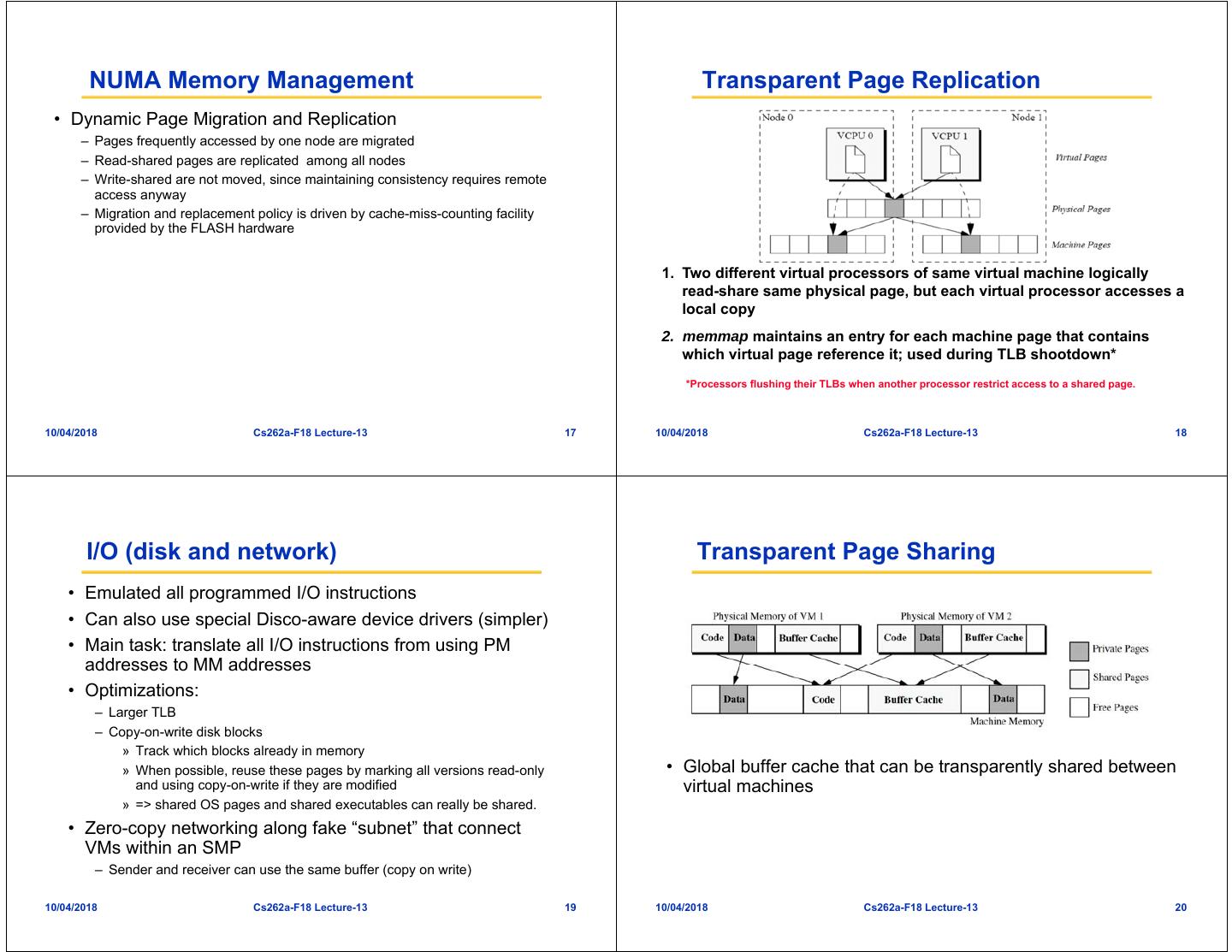 5 . NUMA Memory Management Transparent Page Replication • Dynamic Page Migration and Replication – Pages frequently accessed by one node are migrated – Read-shared pages are replicated among all nodes – Write-shared are not moved, since maintaining consistency requires remote access anyway – Migration and replacement policy is driven by cache-miss-counting facility provided by the FLASH hardware 1. Two different virtual processors of same virtual machine logically read-share same physical page, but each virtual processor accesses a local copy 2. memmap maintains an entry for each machine page that contains which virtual page reference it; used during TLB shootdown* *Processors flushing their TLBs when another processor restrict access to a shared page. 10/04/2018 Cs262a-F18 Lecture-13 17 10/04/2018 Cs262a-F18 Lecture-13 18 I/O (disk and network) Transparent Page Sharing • Emulated all programmed I/O instructions • Can also use special Disco-aware device drivers (simpler) • Main task: translate all I/O instructions from using PM addresses to MM addresses • Optimizations: – Larger TLB – Copy-on-write disk blocks » Track which blocks already in memory » When possible, reuse these pages by marking all versions read-only • Global buffer cache that can be transparently shared between and using copy-on-write if they are modified virtual machines » => shared OS pages and shared executables can really be shared. • Zero-copy networking along fake “subnet” that connect VMs within an SMP – Sender and receiver can use the same buffer (copy on write) 10/04/2018 Cs262a-F18 Lecture-13 19 10/04/2018 Cs262a-F18 Lecture-13 20