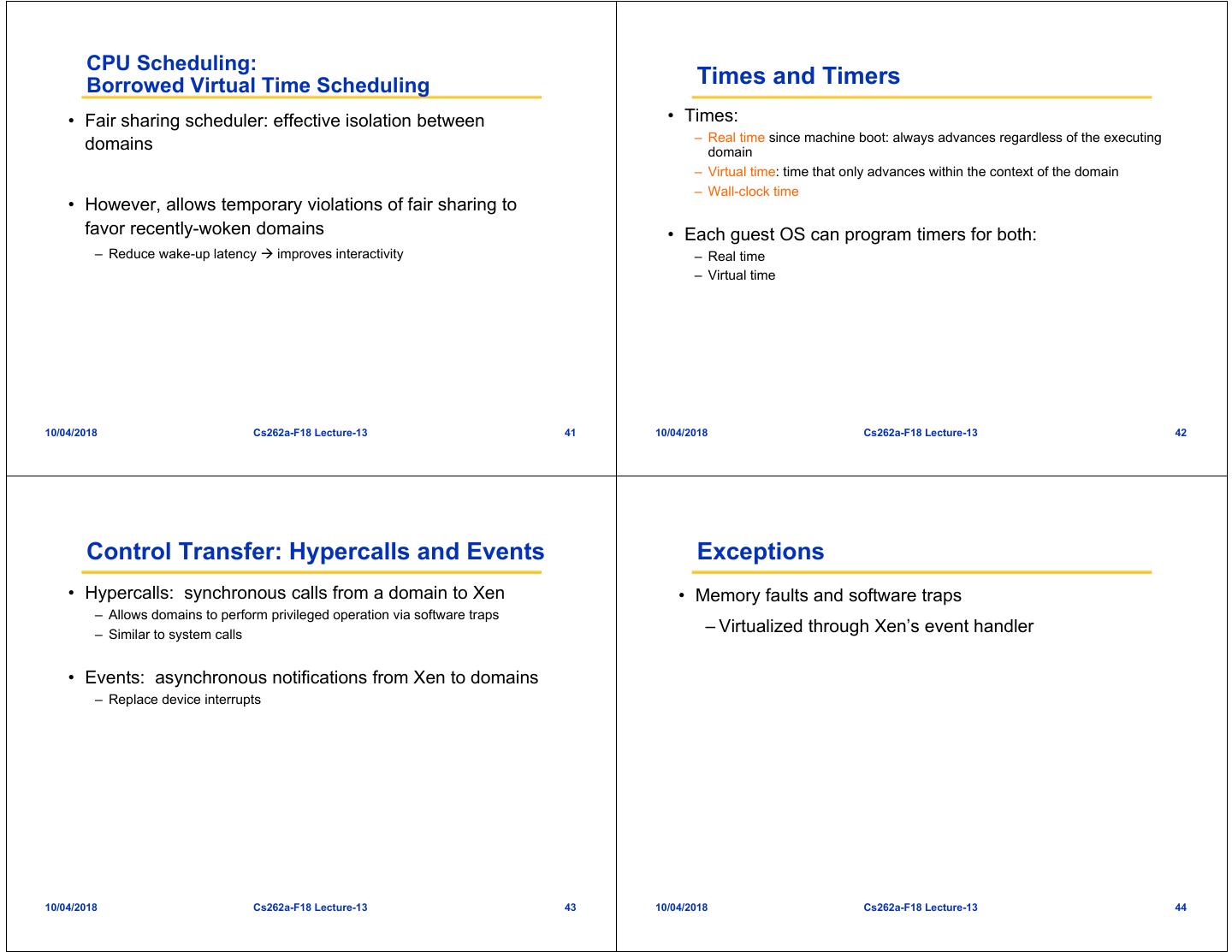 11 . CPU Scheduling: Borrowed Virtual Time Scheduling Times and Timers • Fair sharing scheduler: effective isolation between • Times: – Real time since machine boot: always advances regardless of the executing domains domain – Virtual time: time that only advances within the context of the domain – Wall-clock time • However, allows temporary violations of fair sharing to favor recently-woken domains • Each guest OS can program timers for both: – Reduce wake-up latency improves interactivity – Real time – Virtual time 10/04/2018 Cs262a-F18 Lecture-13 41 10/04/2018 Cs262a-F18 Lecture-13 42 Control Transfer: Hypercalls and Events Exceptions • Hypercalls: synchronous calls from a domain to Xen • Memory faults and software traps – Allows domains to perform privileged operation via software traps – Similar to system calls – Virtualized through Xen’s event handler • Events: asynchronous notifications from Xen to domains – Replace device interrupts 10/04/2018 Cs262a-F18 Lecture-13 43 10/04/2018 Cs262a-F18 Lecture-13 44