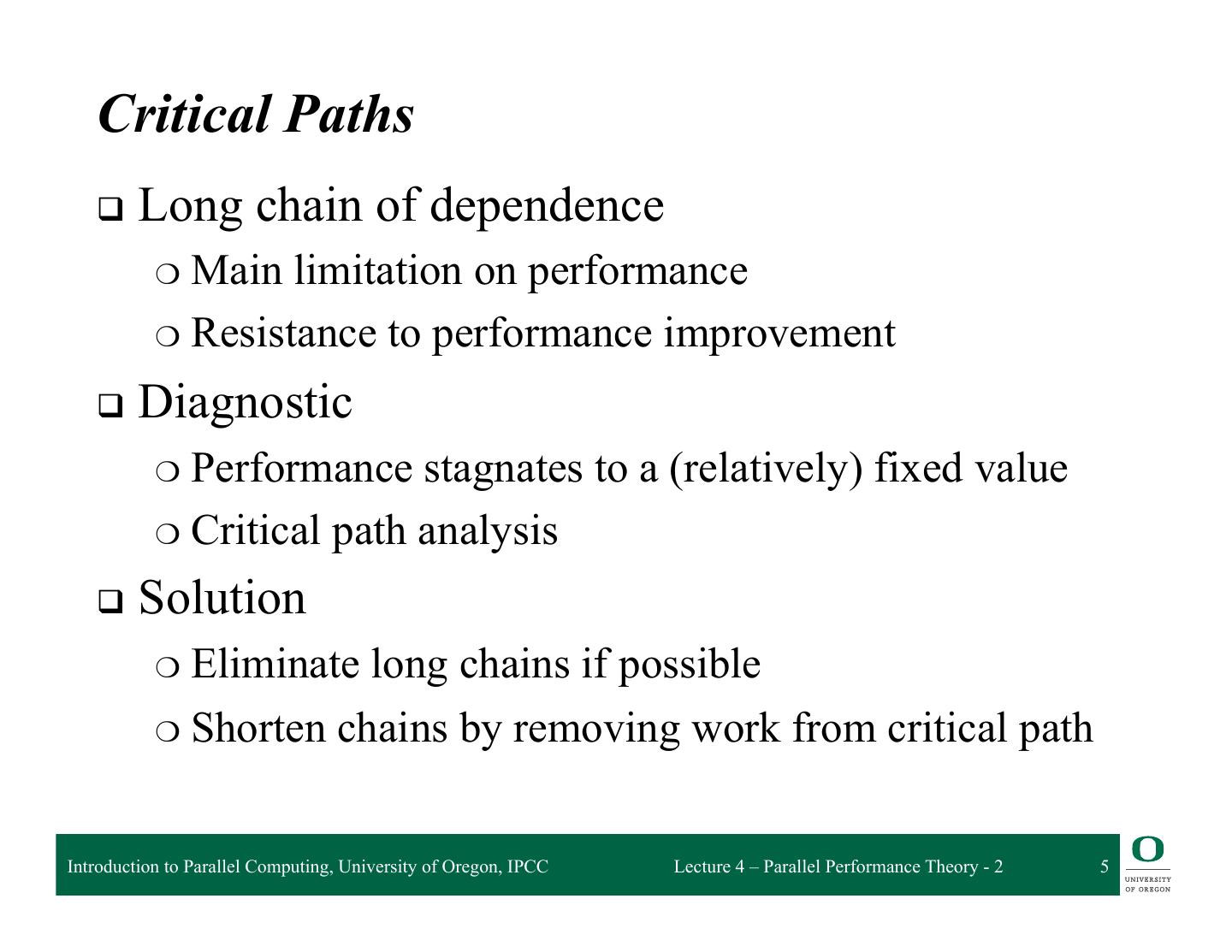 5 . Critical Paths q Long chain of dependence ❍ Main limitation on performance ❍ Resistance to performance improvement q Diagnostic ❍ Performance stagnates to a (relatively) fixed value ❍ Critical path analysis q Solution ❍ Eliminate long chains if possible ❍ Shorten chains by removing work from critical path Introduction to Parallel Computing, University of Oregon, IPCC Lecture 4 – Parallel Performance Theory - 2 5