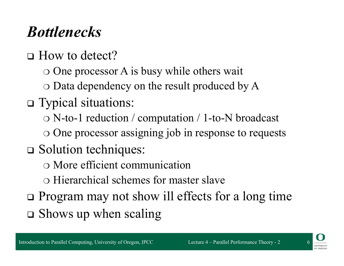6 . Bottlenecks q How to detect? ❍ One processor A is busy while others wait ❍ Data dependency on the result produced by A q Typical situations: ❍ N-to-1 reduction / computation / 1-to-N broadcast ❍ One processor assigning job in response to requests q Solution techniques: ❍ More efficient communication ❍ Hierarchical schemes for master slave q Program may not show ill effects for a long time q Shows up when scaling Introduction to Parallel Computing, University of Oregon, IPCC Lecture 4 – Parallel Performance Theory - 2 6