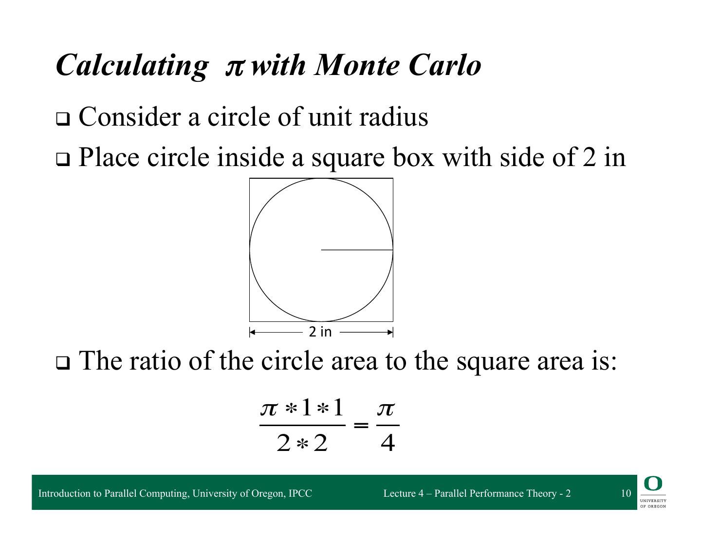 10 . Calculating π with Monte Carlo q Consider a circle of unit radius q Place circle inside a square box with side of 2 in 2 in q The ratio of the circle area to the square area is: π ∗1 ∗1 π = 2∗2 4 Introduction to Parallel Computing, University of Oregon, IPCC Lecture 4 – Parallel Performance Theory - 2 10