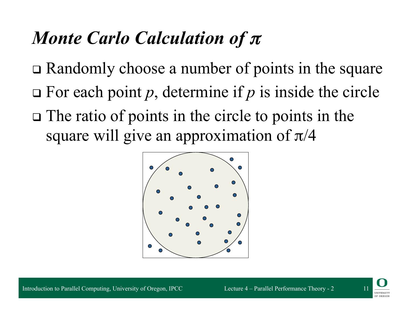 11 . Monte Carlo Calculation of π q Randomly choose a number of points in the square q For each point p, determine if p is inside the circle q The ratio of points in the circle to points in the square will give an approximation of π/4 Introduction to Parallel Computing, University of Oregon, IPCC Lecture 4 – Parallel Performance Theory - 2 11